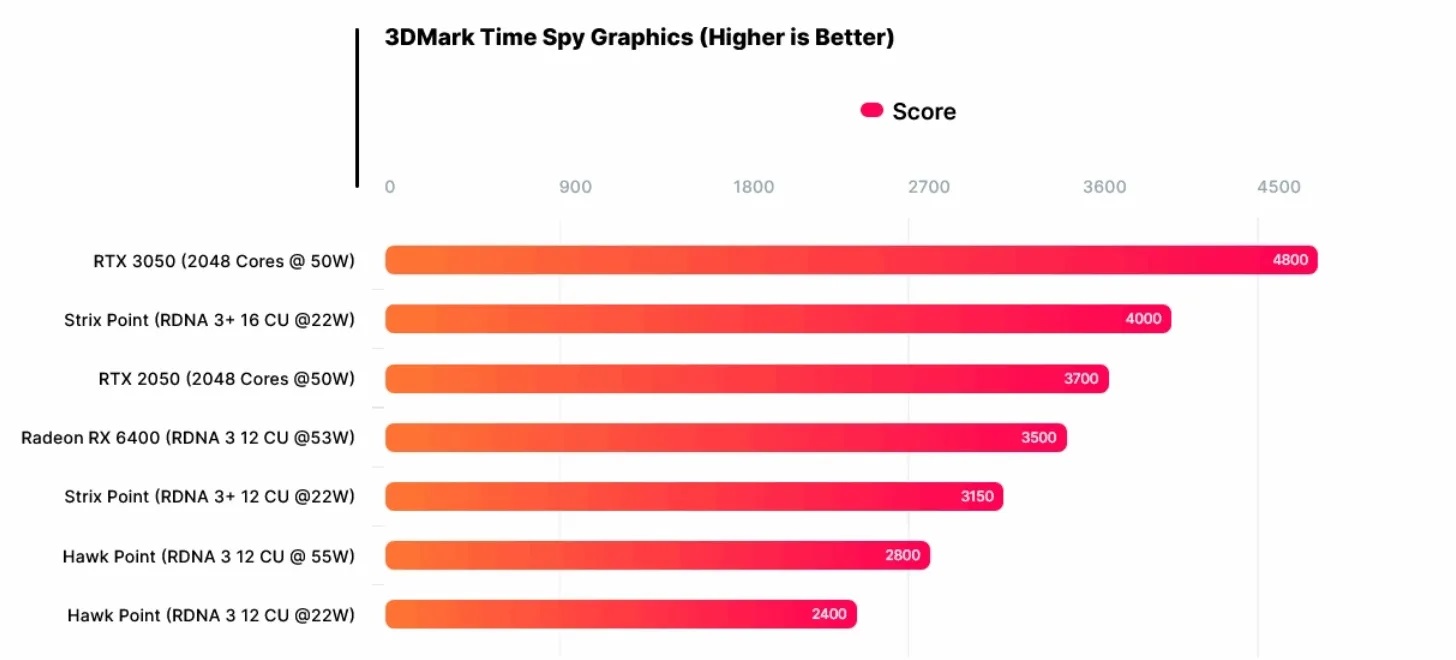Вбудована графіка чипів AMD Strix Point, за попередньою інформацією, налічуватиме до 16 Compute Units покоління RDNA 3+. Стверджується, що у бенчмарку 3DMark Time Spy такий iGPU здатний набрати близько чотирьох тисяч балів за рівня TDP процесора близько 22-24 Вт. Це більше показників мобільного відеоадаптера GeForce RTX 2050 у 50-ватному режимі. Орієнтовні результати найближчих суперників та варіанта APU Strix Point з графікою на 12 CU наведено нижче.