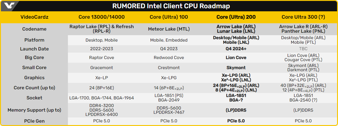У процесорах Intel Arrow Lake, згідно з наявною інформацією, використовуватиметься до 8 високопродуктивних ядер Lion Cove та до 16 енергоефективних ядер Skymont. Нові CPU також отримають два додаткові LP-ядра в кристалі із системною логікою, графічний блок Xe-LPG та окремий модуль для прискорення операцій зі штучним інтелектом. Сама Intel називає їх «першими ігровими процесорами з ШІ-прискорювачем».
