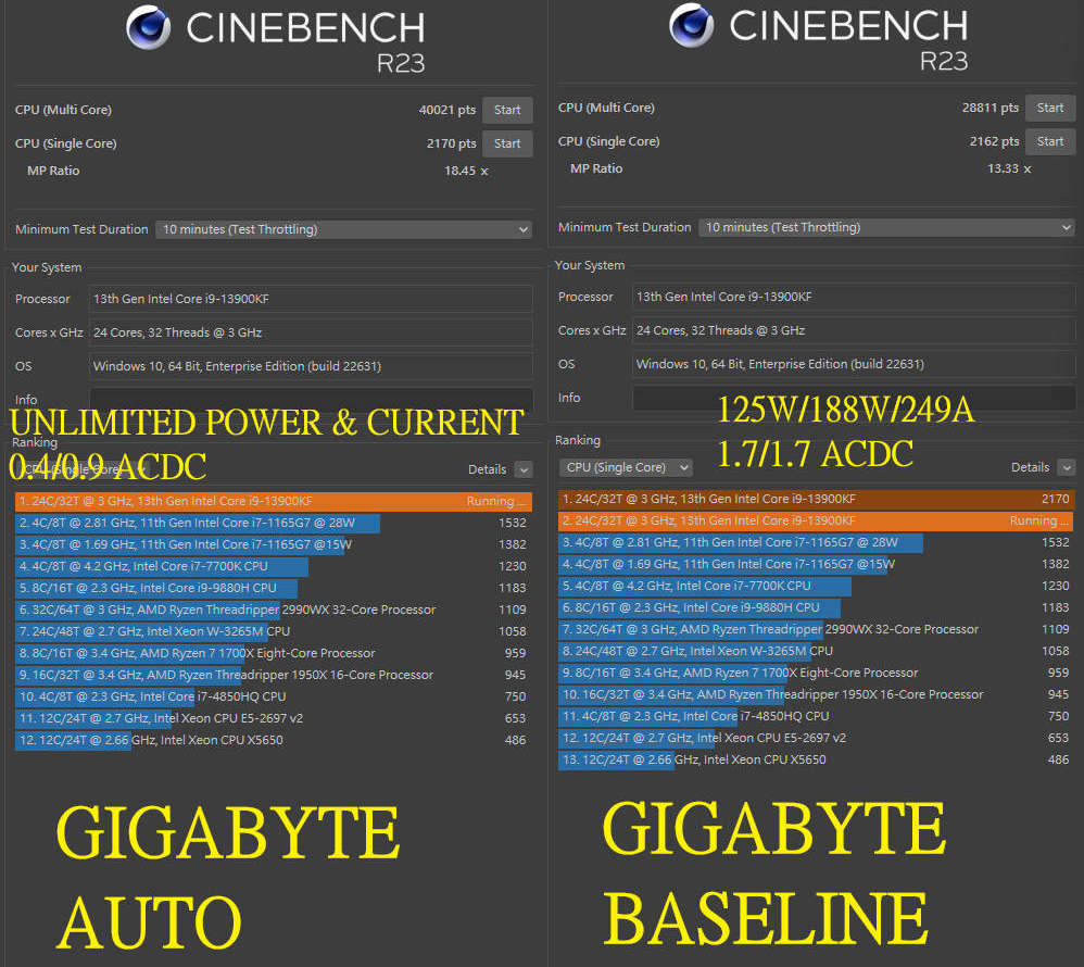 У Мережі вже доступні результати перших тестів до і після активації Intel Baseline на системних платах Gigabyte. Наприклад, результат Core i9-13900KF на платі Z790 Aorus Tachyon у бенчмарку Cinebench R23 опустився до рівня Core i7 — з 40 тисяч до 28,8 тис. балів. В іграх падіння не таке суттєве, але теж спостерігається порівняно з «розблокованим» CPU.