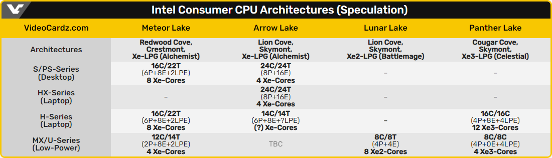 Не встигла Intel випустити мобільні процесори Lunar Lake, як у Мережі почали з'являтися перші подробиці про їхніх наступників. Йдеться про сімейство Panther Lake, яке заплановано до релізу орієнтовно у 2025 році. До нього увійдуть щонайменше дві лінійки процесорів: Panther Lake-U для тонких та легких лептопів, а також Panther Lake-H для більш продуктивних ноутбуків.