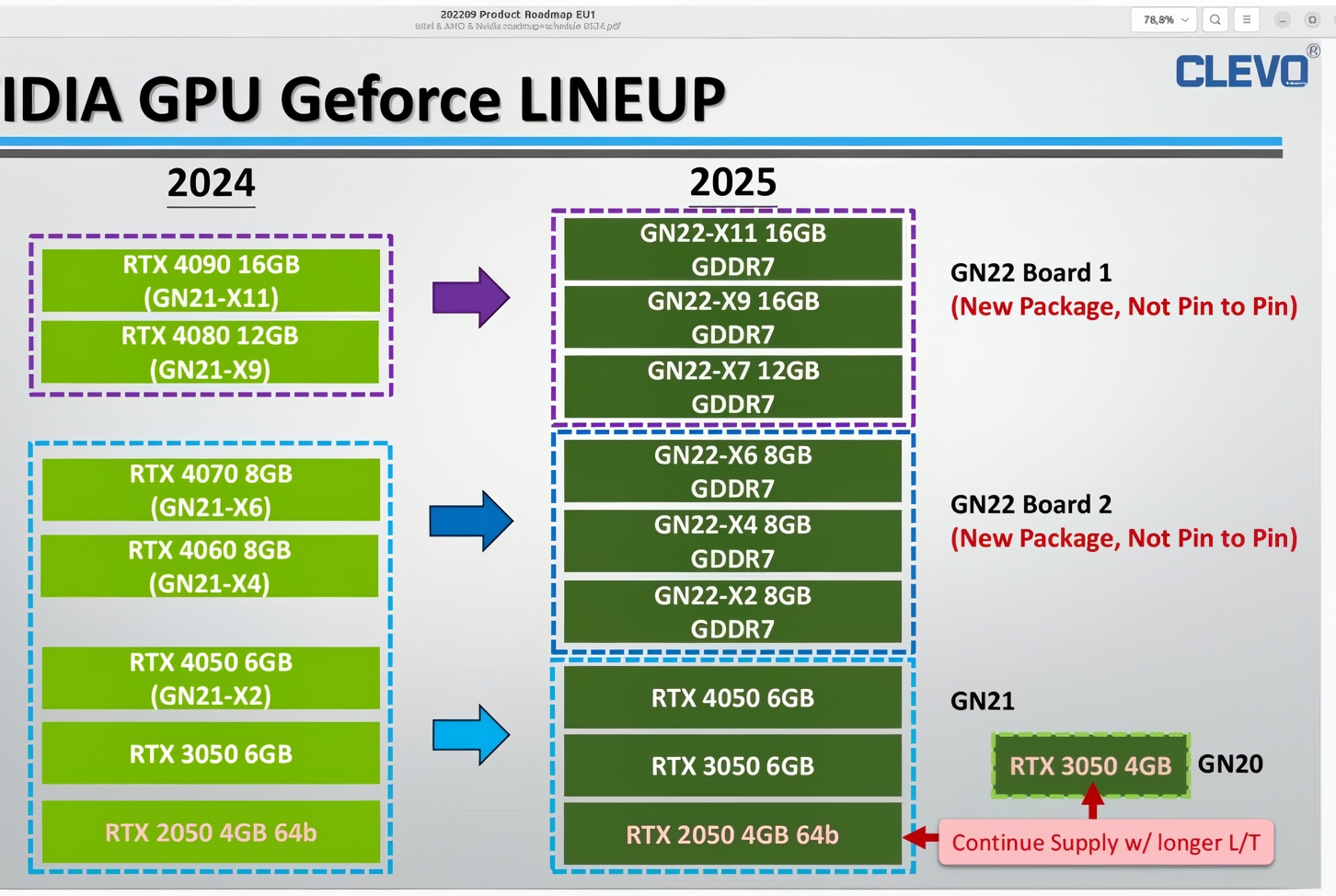 До Мережі потрапили конфіденційні документи ODM-виробника ноутбуків Clevo, в яких розкриваються плани вендора щодо оновлення «начинки» своїх пристроїв. Зокрема, на 2025 рік він запланував випуск ігрових ноутбуків із дискретними відеоадаптерами GeForce RTX 50-ї серії.
