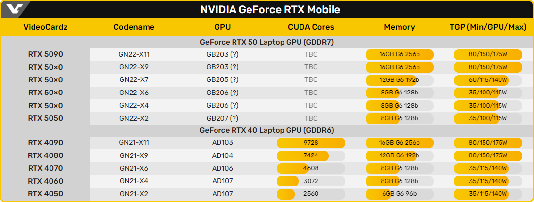 Судячи з наданої інформації, Nvidia готує не менше шести мобільних 3D-прискорювачів Blackwell. Всі вони використовуватимуть мікросхеми пам'яті GDDR7, а обсяг відеобуфера складе від 8 до 16 Гбайт. Враховуючи, що для перших чипів GDDR7 характерна місткість 16 Гбіт (2 ГБ), ширина шини пам'яті в новинок повинна скласти 128, 192 та 256 розрядів. Подробиць про конфігурацію GPU, на жаль, Clevo у своїх документах не наводить.