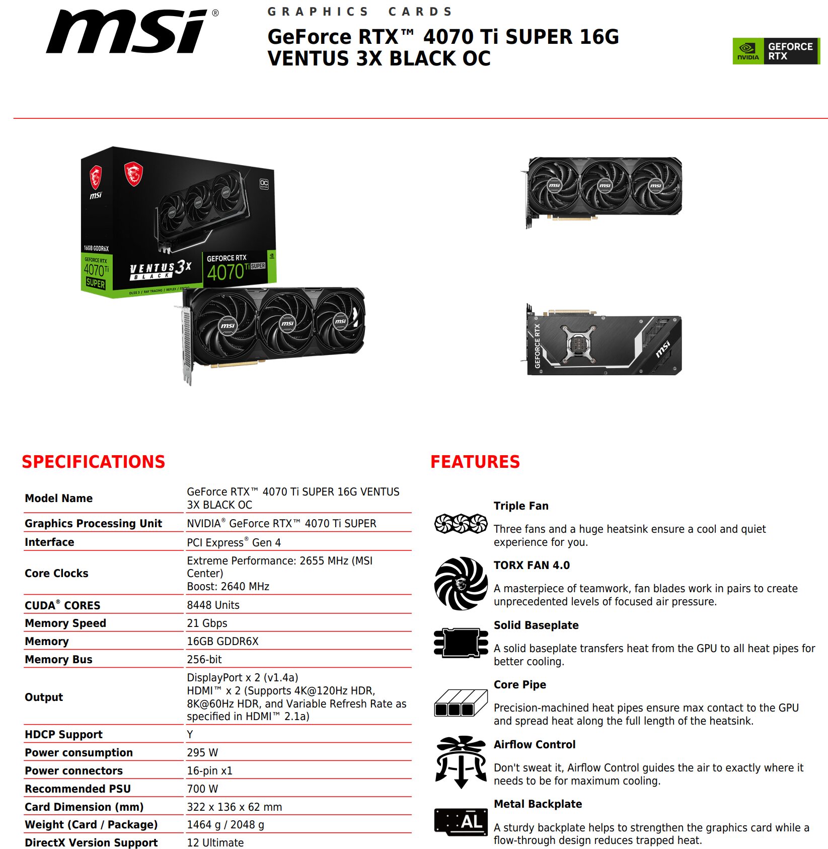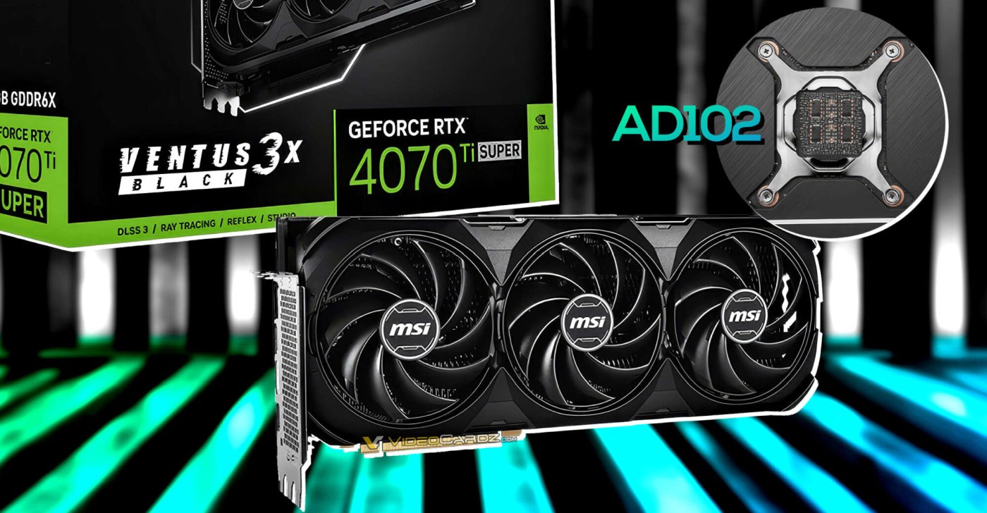 Компанія підготувала відеокарту GeForce RTX 4070 Ti Super Ventus 3X Black OC, яка виділяється на тлі інших відеокарт цієї серії застосуванням старшого GPU. В основі звичайної версії GeForce RTX 4070 Ti графічний процесор AD103-275 з 8448 потоковими ядрами CUDA. Але згідно з описом на сайті, у новій моделі MSI Ventus 3X використовується старший AD102.