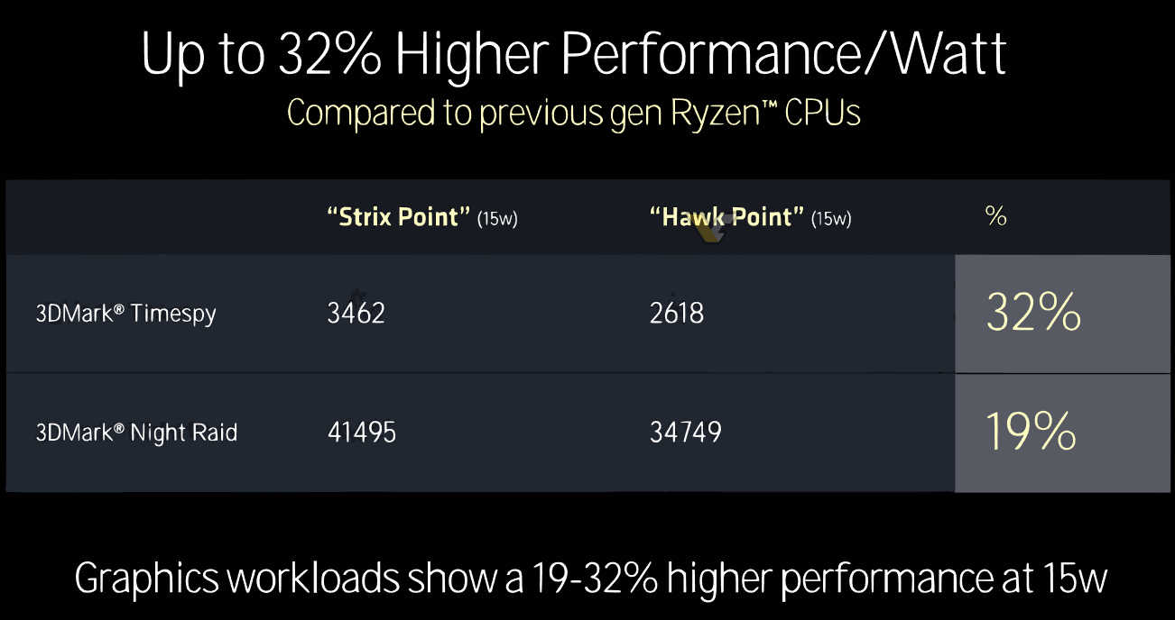 Мобільні процесори AMD Ryzen AI 300 (Strix Point) вже встигли прописатися в онлайн-базах тестових пакетів, продемонструвавши непогану продуктивність як x86-ядер, так і вбудованої графіки. Тепер з'явилися додаткові бенчмарки від самого «червоного» чипмейкера. AMD порівняла графічну швидкодію APU Strix Point з попередниками та найближчими конкурентами.