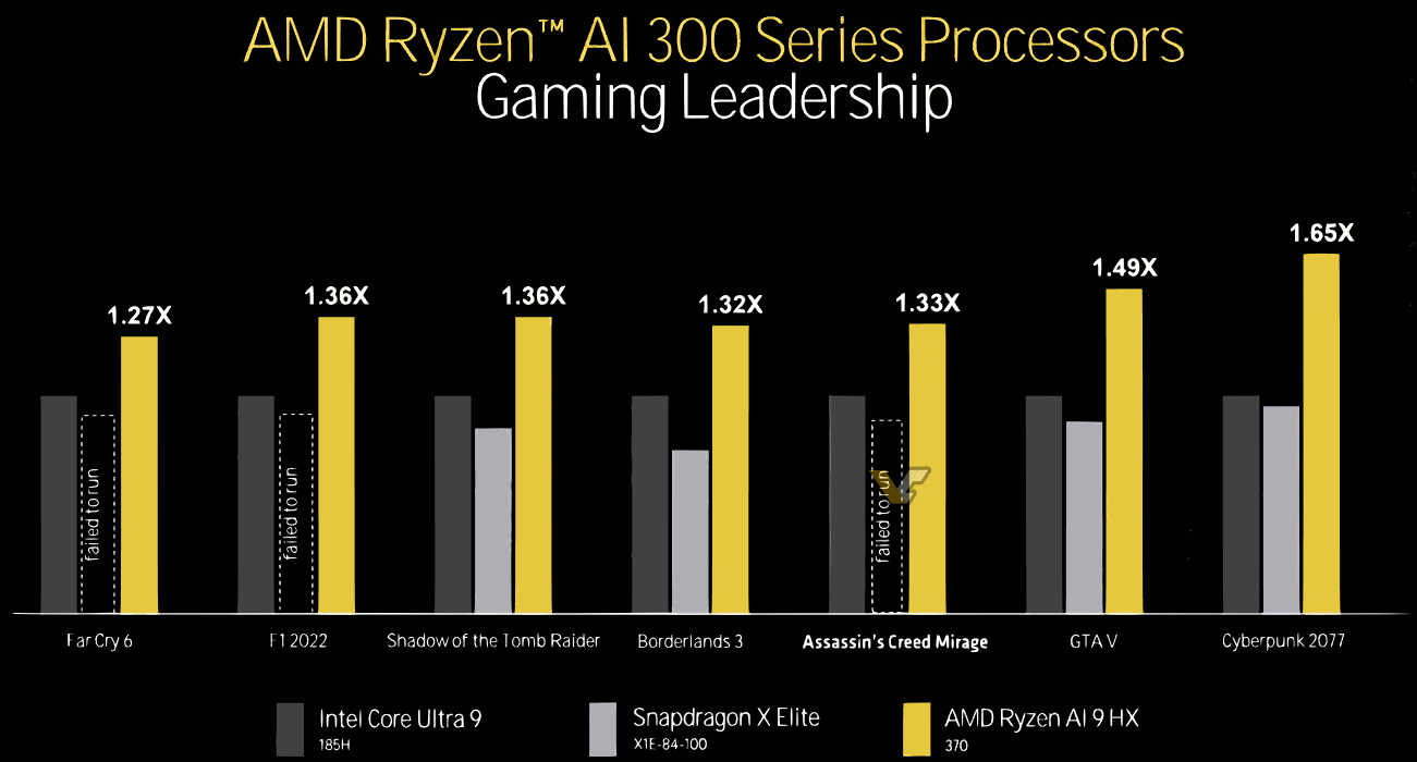 У 15-ватному режимі процесори AMD Strix Point забезпечують на 19-32% кращу продуктивність у бенчмарках 3DMark порівняно з актуальними чипами Hawk Point (серія Ryzen 8040). Що стосується ігрової швидкодії, то тут «червоні» знову заявляють про своє лідерство. На слайді нижче порівнюється продуктивність Ryzen AI 9 HX 370 і найближчих конкурентів в особі Intel Core Ultra 9 185H і Snapdragon X Elite, причому на SoC Qualcomm деякі ігри запустити не вдалося.