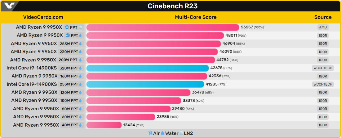 У таблиці нижче зібрані результати нового флагмана AM5 з різними показниками PPT (Package Power Tracking). На тлі конкурента в AMD вийшов доволі енергоефективний процесор, наприклад, у Cinebench R23 він наздоганяє Intel Core i9-14900KS вже за 160-ватного рівня PPT. Без переходу на екстремальні види охолодження з Ryzen 9 9950X можна буде «вичавити» близько 48 тисяч балів.