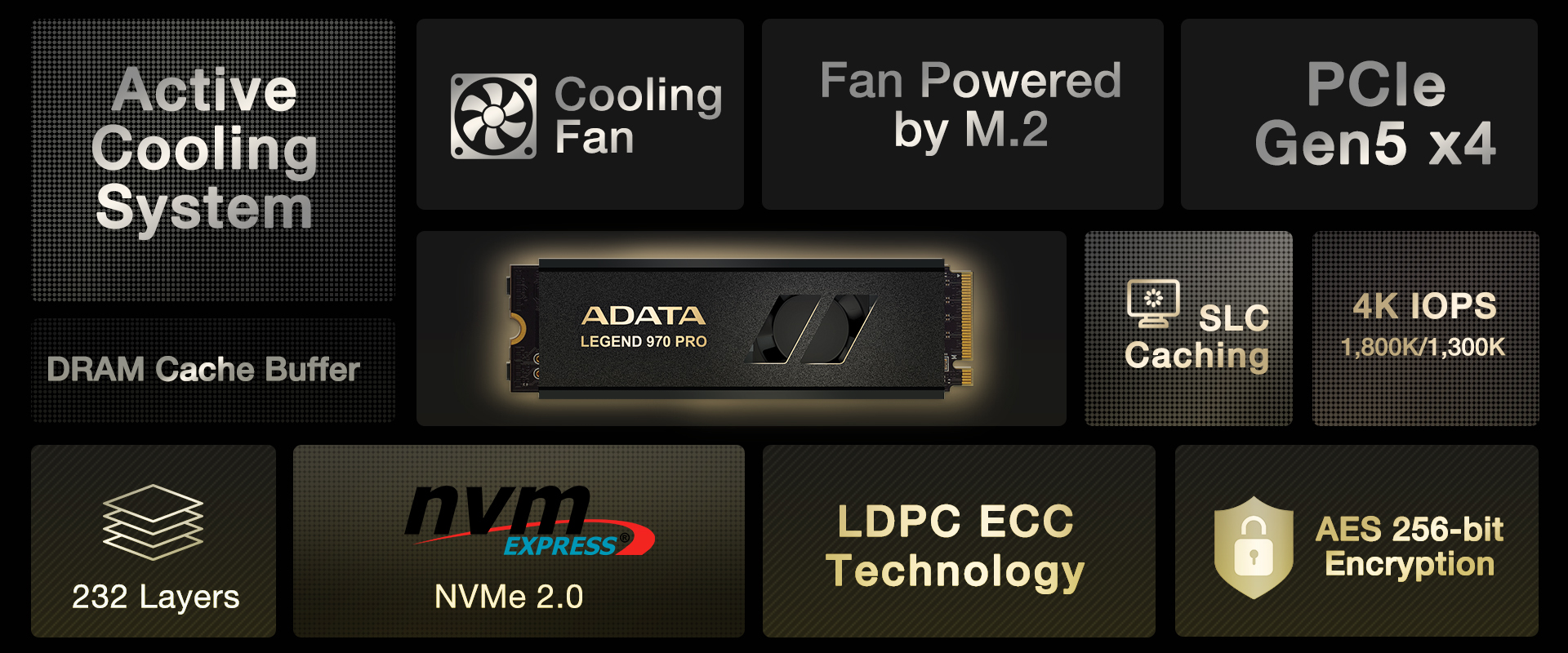 Компанія Adata Technology підготувала до випуску лінійку твердотілих накопичувачів Legend 970 PRO з інтерфейсом PCI Express 5.0 x4. Вона представлена пристроями формату M.2 2280 місткістю 1, 2 і 4 ТБ. Примітною особливістю новинок стала активна система охолодження, що складається з алюмінієвого радіатора і невеликого вентилятора.