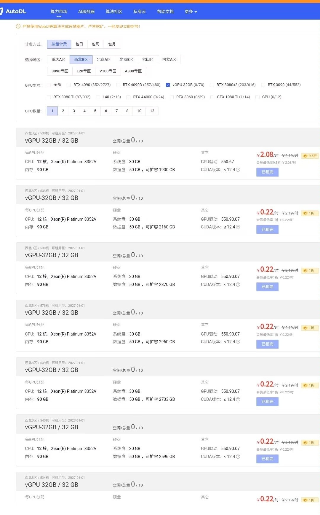 Це GeForce RTX 4090D з 48 гігабайтами пам'яті GDDR6X та GeForce RTX 4080 Super з 32 гігабайтами GDDR6X. Нагадаємо, що стандартні версії цих відеокарт оснащені 24 ГБ та 16 ГБ, відповідно. І компанія Nvidia ніколи не випускала такі відеокарти з подвоєним обсягом пам'яті. Цікаво, що у вебінтерфейсі сервісу GeForce RTX 4080 Super 32GB позначена як невідомий vGPU-32GB, і одна година роботи на такому GPU коштує лише 3 центи.