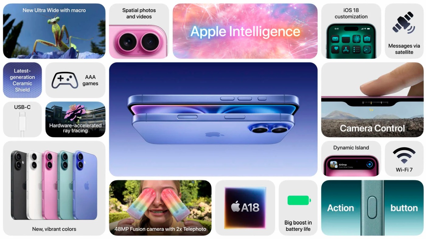 iPhone 16 отримав екран OLED діагоналлю 6,1 дюйма з частотою 60 Гц з піковою яскравістю 2000 ніт, в iPhone 16 Plus екран 6,7 дюйма та акумулятор більшої місткості. Обидва варіанти оснащені подвійною камерою з тильного боку, основний сенсор 48 Мп. В основі нового покоління процесор Apple A18, вироблений за технологією 3 нм. Усі моделі отримають підтримку додаткових функцій для спілкування, пошуку і фото та основі штучного інтелекту Apple Intelligence.