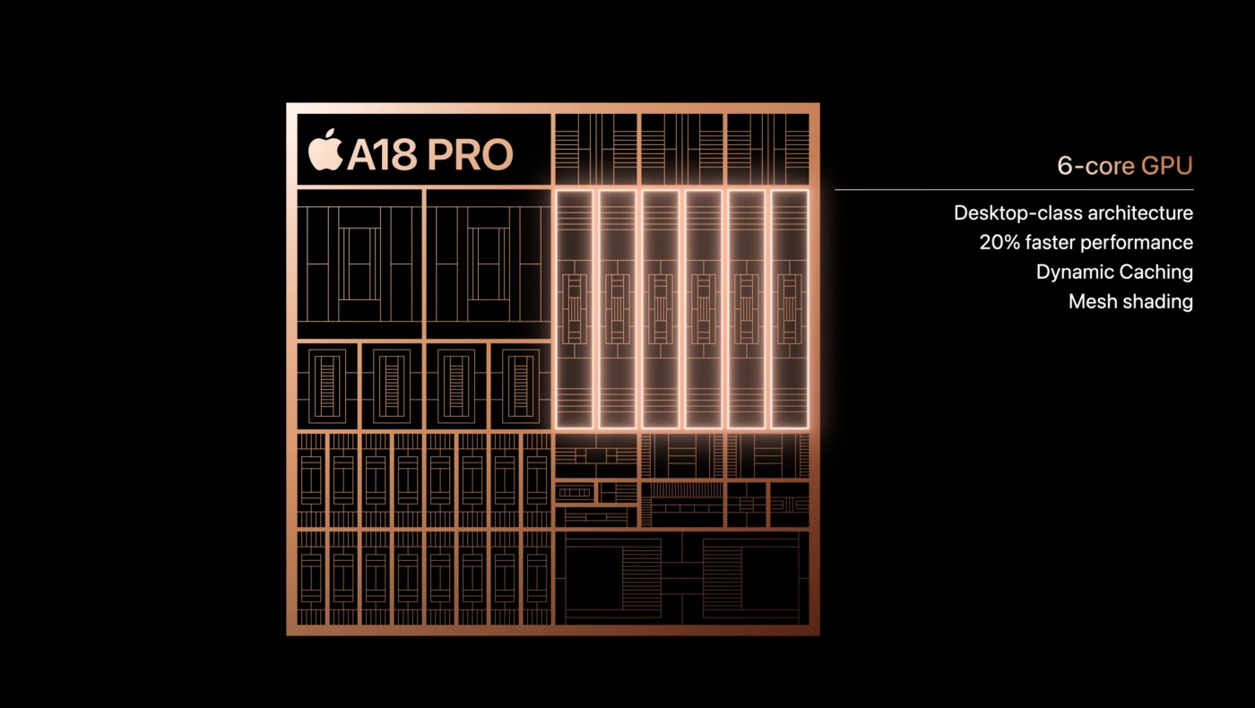 Нове покоління iPhone використовує 3-нм чип Apple A18, який в середньому на 30% швидший за минулий Apple A16, що досягається завдяки численним поліпшенням та оптимізаціям. Зокрема, сильно прокачали GPU з шістьма обчислювальними блоками. Графічний прискорювач у середньому наростив продуктивність на 20% відносно графіки в iPhone 15 Pro і вдвічі краще справляється з апаратним трасуванням променів. Базова версія iPhone 16 отримає п'ять блоків у GPU, а iPhone 16 Pro працюватиме з шістьма активними блоками.