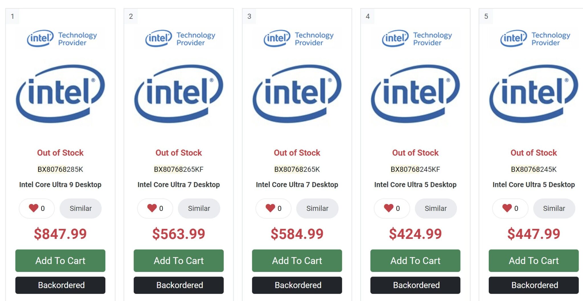 Судячи з наданої інформації, нові десктопні процесори коштуватимуть приблизно стільки ж, скільки їхні попередники для платформи LGA1700. Зокрема, флагманський Core Ultra 9 285K був оцінений канадським ритейлером у 848 доларів (еквівалент 626 дол. США). Це всього на 3% більше, ніж той самий магазин нині просить за Core i9-14900K. Водночас модель Core Ultra 7 265K виявилася на 2% дешевшою за Core i7-14700K, а молодший Core Ultra 5 245K доступний за ціною Core i5-14600K. Канадські ціни десктопних процесорів Intel Core Ultra: