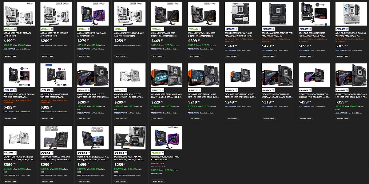У закордонних магазинах ціни материнських плат X870/X870E починаються приблизно з 200-доларової позначки. Доступні й топові моделі, на кшталт ASUS ROG Crosshair X870E Hero, яка була оцінена в $700. Що стосується України, то асортимент у вітчизняних ритейлерів поки дещо обмежений. Але, наприклад, в інтернет-магазині Telemart ціни на нові плати починаються з 13 тисяч гривень. У таку суму обійдеться модель ASUS Prime X870-P.