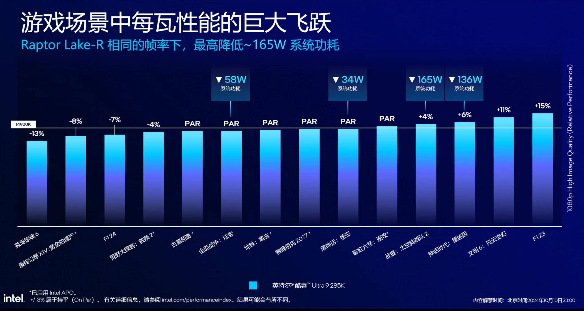Intel визнає, що нові процесори не принесуть надбавки ігрової швидкодії щодо прямих попередників. У середньому Core Ultra 9 285K забезпечить приблизно ту саму частоту кадрів, що і Core i9-14900K. З іншого боку, новий десктопний флагман Intel має менші «апетити», завдяки чому енергоспоживання всієї системи знизиться на показник до 165 Вт.