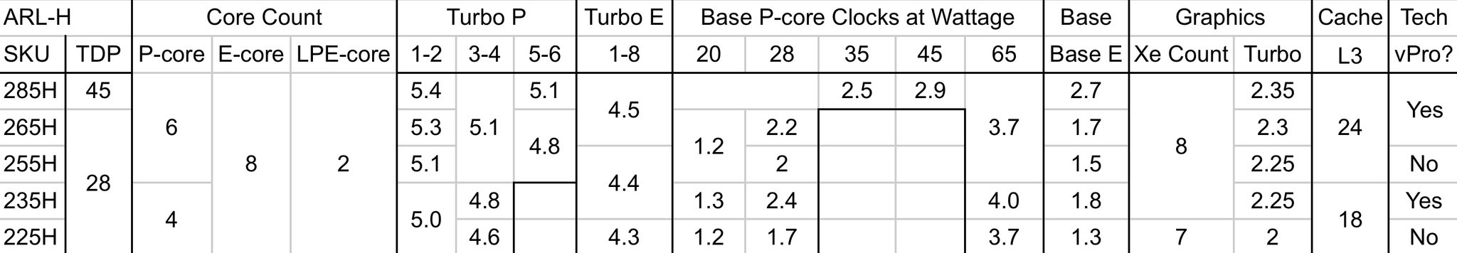 Мобільні процесори Intel Arrow Lake-H стануть повноправними наступниками CPU Core Ultra 100H (Meteor Lake). У них компанія використовуватиме багаточипове компонування, а старші моделі зможуть запропонувати до шести P-ядер з архітектурою Lion Cove та до восьми E-ядер Skymont разом із двома LPE-ядрами. Як і у випадку десктопних аналогів, підтримка Hyper-Threading відсутня. Оснащення новинок також включає до 24 МБ L3-кешу, графіку Xe-LPG+ на сім або вісім Xe-ядер та NPU-блок для прискорення ШІ-застосунків. Штатний рівень TDP дорівнює 28 або 45 Вт.