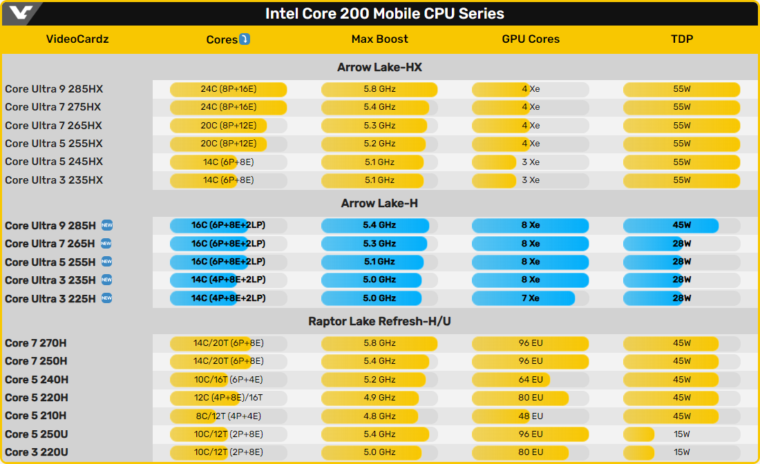 Окрім лінійки Core Ultra 200H корпорація Intel також планує випустити серію Core Ultra 200HX (Arrow Lake-HX). Вони, грубо кажучи, є десктопними CPU Arrow Lake у конструктивному виконанні BGA. В їхньому арсеналі є до 24 ядер (8P+16E) без підтримки Hyper-Threading і вбудована графіка Xe-LPG, що налічує до 4 Xe-ядер. Порівняти характеристики процесорів Arrow Lake-H та Arrow Lake-HX можна у таблиці.