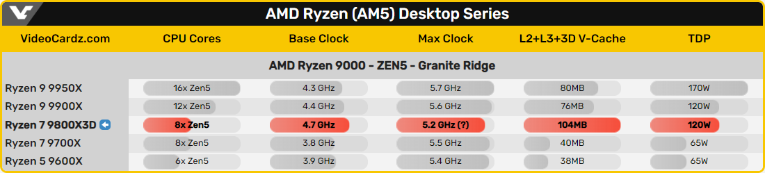 Процесор AMD Ryzen 7 9800X3D, який MaxSun чомусь відносить до лінійки Ryzen 9, отримає вісім ядер Zen 5 з базовою частотою 4,7 ГГц та сумарно 96 МБ кеш-пам'яті третього рівня, що забезпечить йому хорошу ігрову продуктивність. Штатний рівень TDP складе 120 Вт. Це істотно більше, ніж у процесора Ryzen 7 9700X (65 Вт) без 3D V-Cache, та пояснює збільшену на 900 МГц базову частоту.