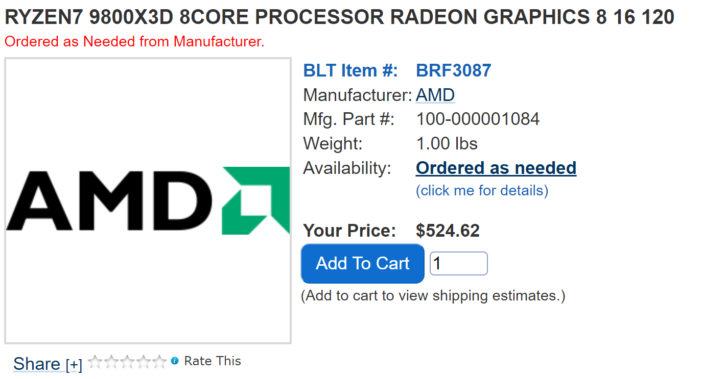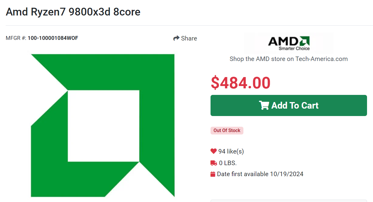 AMD Ryzen 7 9800X3D вже з'явився в закордонних інтернет-магазинах. Новий процесор був оцінений ритейлерами TechAmerica і ShopBLT у 484 і 523 долари. Щодо його рекомендованої ціни інформації поки не надходило, але, за чутками, вона повинна скласти від 449 доларів, як і Ryzen 7 7800X3D на момент релізу.