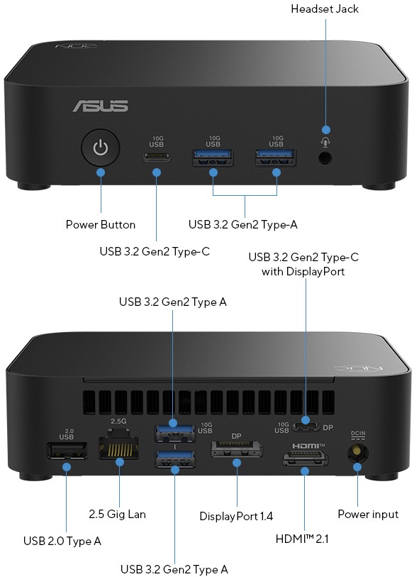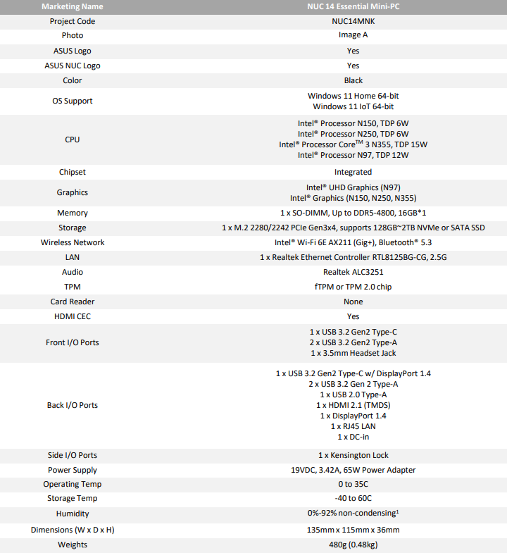 В ASUS NUC 14 Essential можна буде зустріти 4-ядерні/4-потокові процесори Intel N97, N150 і N250, а також 8-ядерний/8-потоковий Core 3 N355. Міні-комп'ютери підтримують встановлення одного модуля оперативної пам'яті SO-DIMM DDR5-4800 й твердотілого накопичувача формату M.2 2280.