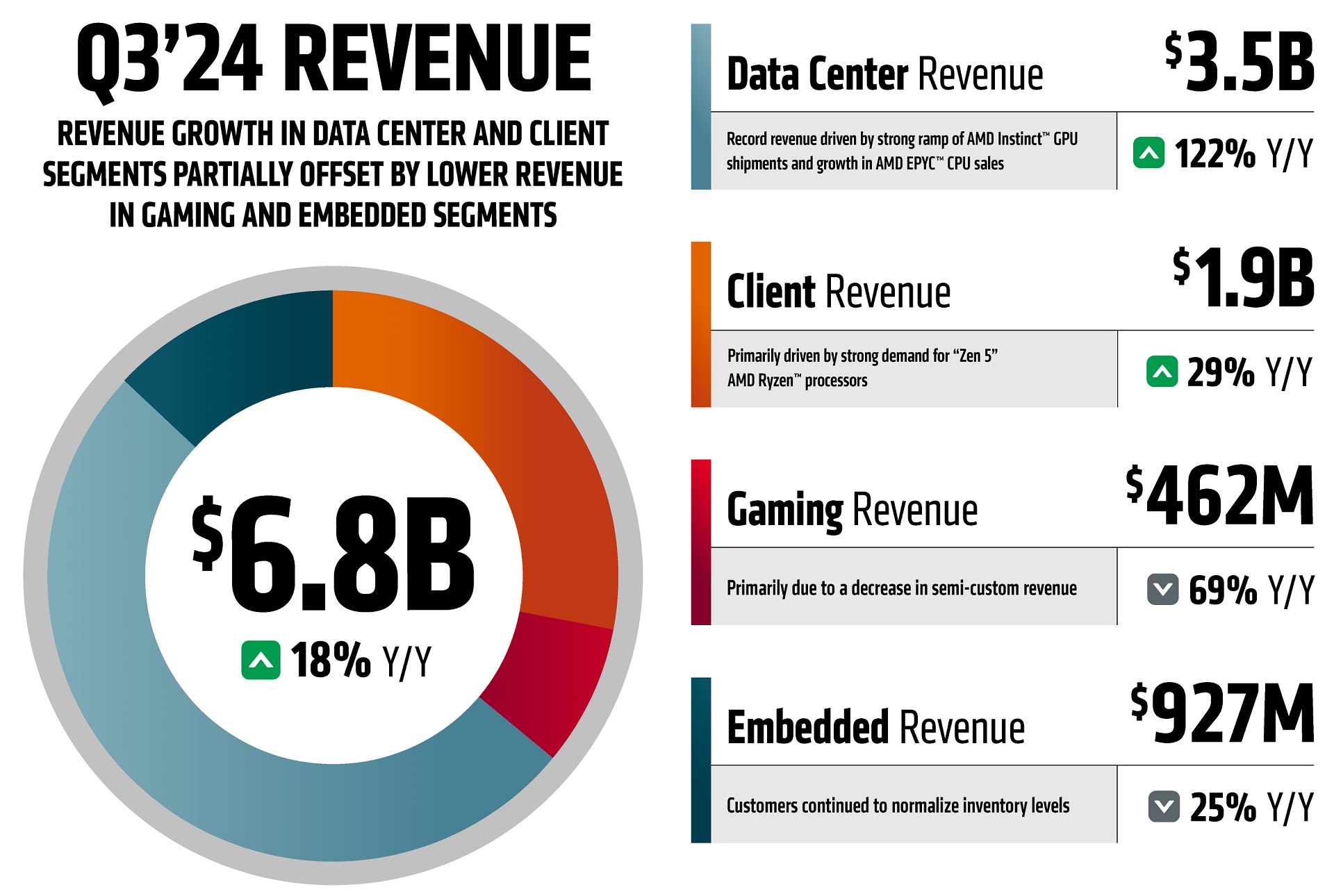 Компанія AMD підбила фінансові підсумки третього кварталу, відзвітувавши про $6,8 млрд виторгу. Це на 18% більше показників аналогічного періоду минулого року. Водночас чистий прибуток чипмейкера склав $771 мільйон, показавши 158% приріст відносно результатів липня-вересня 2023-го.