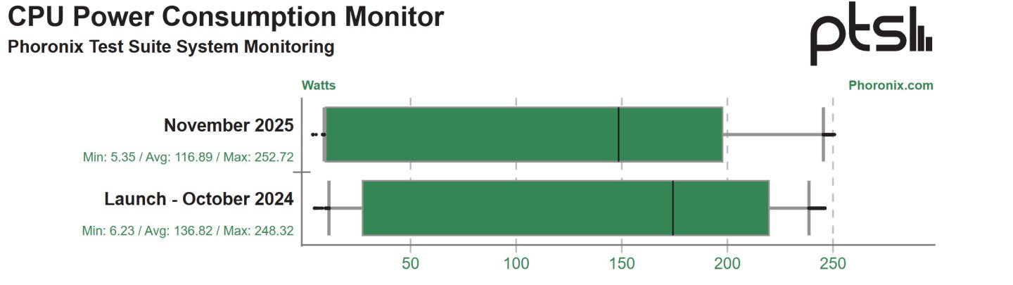 Процесор тестувався на материнській платі ASUS ROG Maximus Z890 Hero у поєднанні з двома планками пам’яті DDR5-6400 по 16 ГБ. Прошивку плати оновлено до останньої версії, але налаштування UEFI ідентичним старим. Також тестери перейшли на нову версію Ubuntu 25.10 з ядром Linux 6.18 Git. Комплексне тестування передбачало 240 бенчмарків різного типу, включно з компіляцією коду, моделюванням фізичних середовищ, 3D-рендерингом, конвертацією відео та багатьма іншими спеціалізованими завданнями. За підсумками тестування процесор показав середній ріст продуктивності близько 9%.