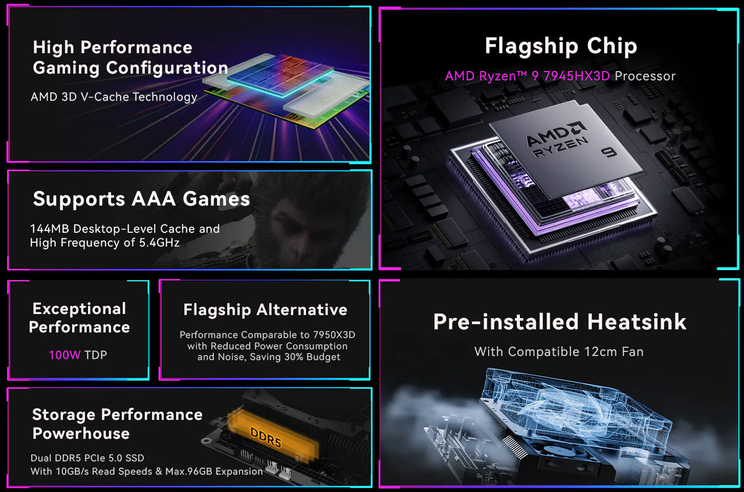В асортименті гонконгської компанії Minisforum з'явилася нова материнська плата з розпаяним мобільним процесором AMD. Цього разу вендор застосував Ryzen 9 7945HX3D. Це флагман сімейства Dragon Range (архітектура Zen 4), який на момент релізу у 2023 році «червоні» називали найшвидшим ігровим процесором для ноутбуків. Особливість цього CPU, як неважко зрозуміти з назви, криється в додатковому обсязі кеш-пам'яті третього рівня.