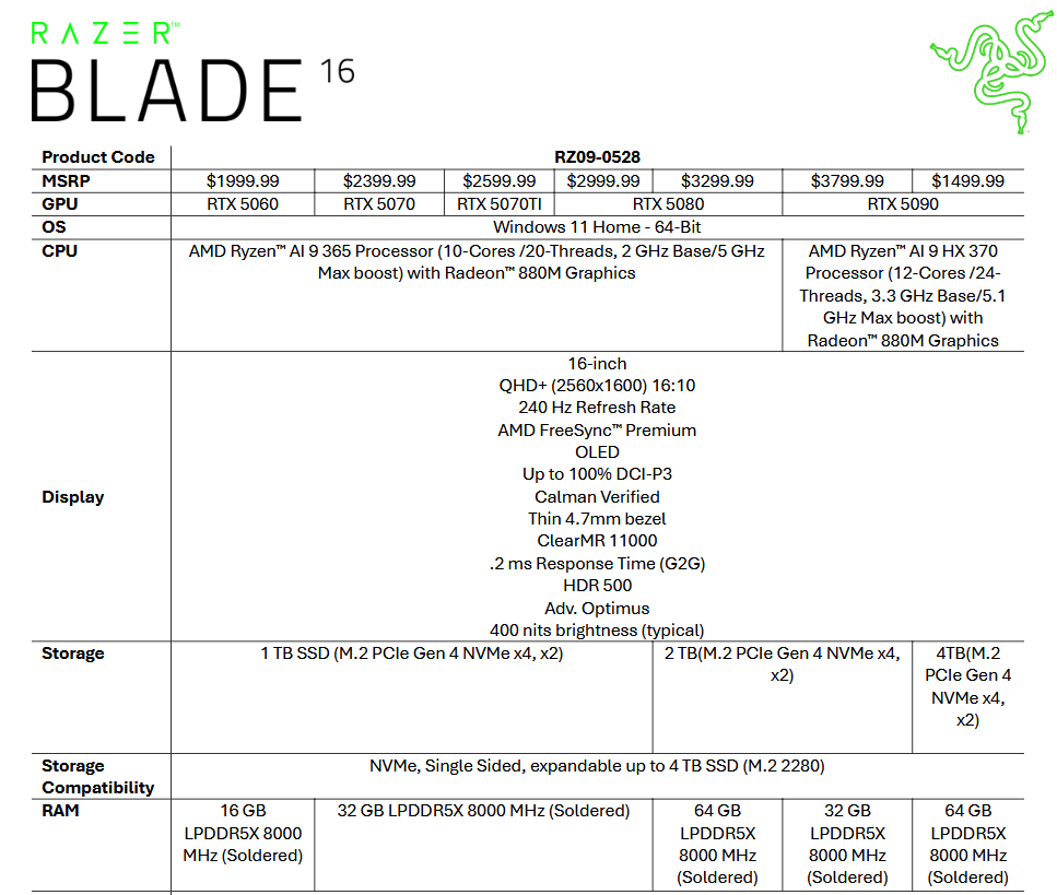 Що стосується самого Razer Blade 16, то він отримає 16-дюймовий OLED дисплей з роздільною здатністю 2560×1600 пікселів і буде виконаний на платформі AMD Strix Point. Зокрема, компанію мобільній GeForce RTX 5060 складе процесор Ryzen AI 9 365 та 16 гігабайтів розпаяної пам’яті LPDDR5X-8000. Рекомендована ціна такої конфігурації складе дві тисячі доларів.
