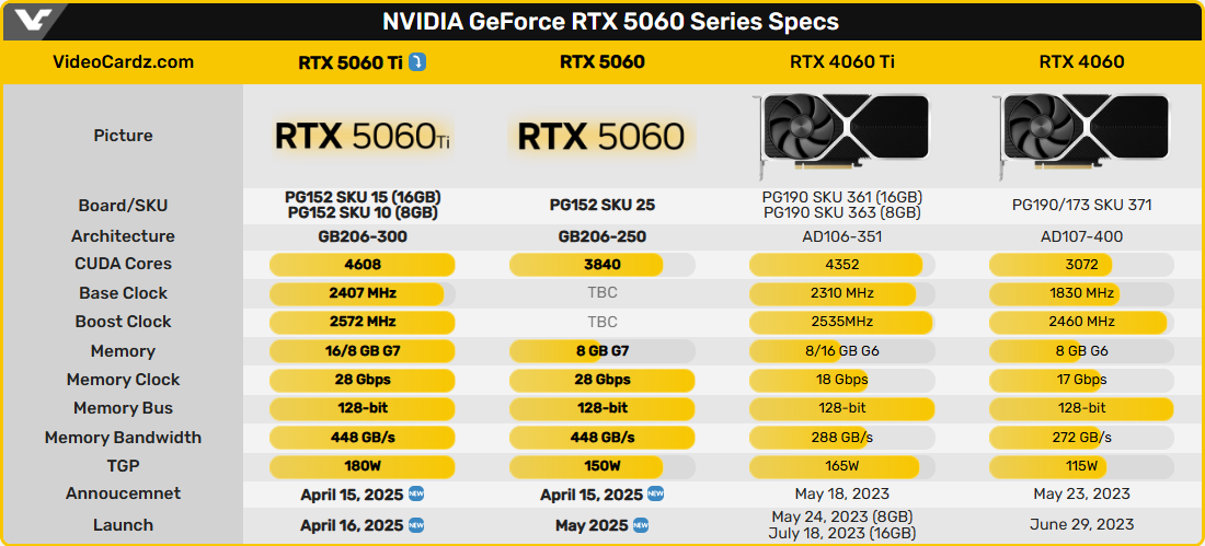 Разом із цим GeForce RTX 5060 надійде в продаж орієнтовно в середині травня. Рекомендовані ціни нових відеокарт Nvidia Blackwell поки не розкриваються, найімовірніше, вони будуть оголошені ближче до релізу. Водночас основні характеристики новинок відомі вже деякий час, порівняти специфікації GeForce RTX 5060 (Ti) та прямих попередників можна в таблиці.