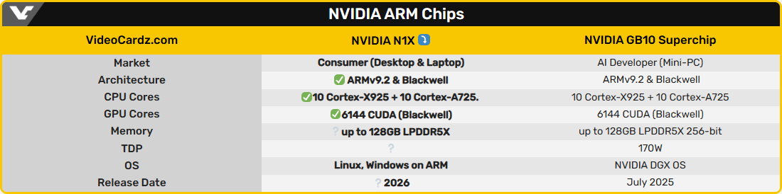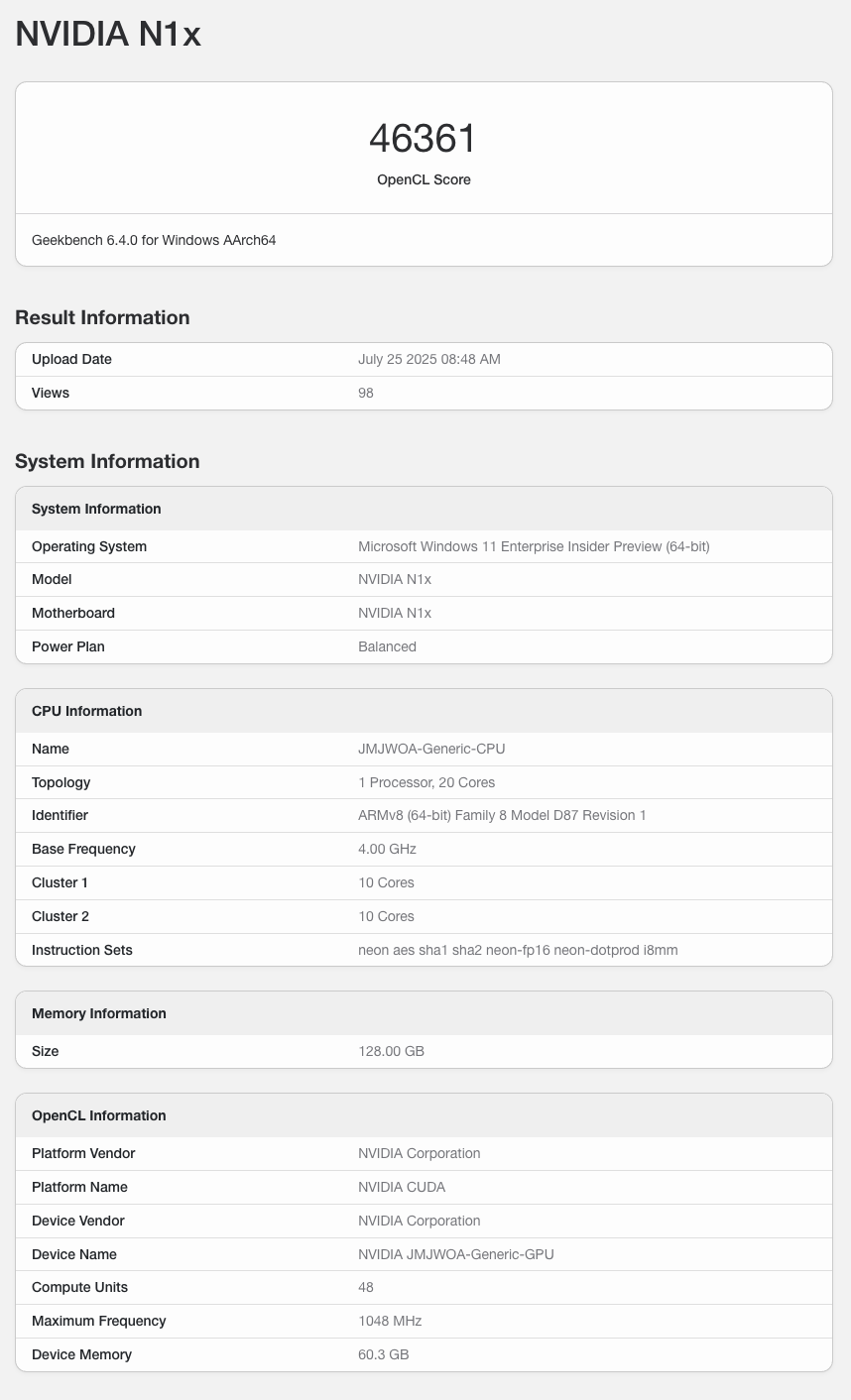 Однокристальна система NVIDIA N1X, призначена для використання в Windows-ноутбуках, продовжує з’являтися в онлайн-базах тестових пакетів. Цього разу вона була помічена в OpenCL-тесті Geekbench, підтвердивши деякі специфікації. Як і очікувалося, за технічними характеристиками вона буде максимально близька до платформи GB10 Superchip, яка використовується в міні-суперкомп’ютерах для штучного інтелекту.