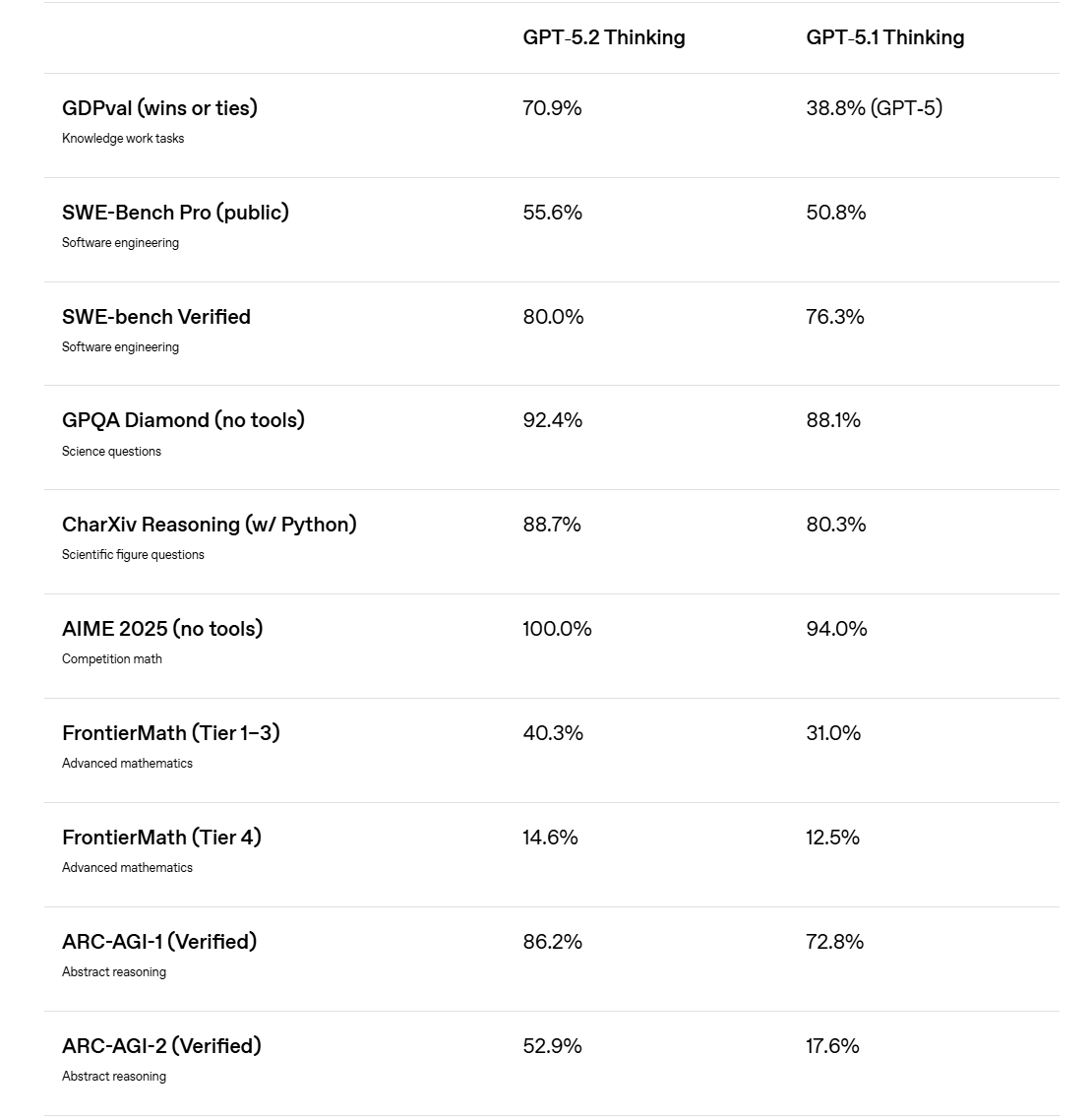 Компанія OpenAI запускає нову модель штучного інтелекту GPT‑5.2, яка покликана стати найкращою. Згідно зі спеціалізованими тестами, вона перевершує GPT‑5.1 в усіх напрямках і демонструє кращі результати в багатьох професійних завданнях. Вона краще проявляє себе в галузі комп’ютерного зору і розпізнає більше об’єктів, краще працює з математичними завданнями та з довгим контекстом.