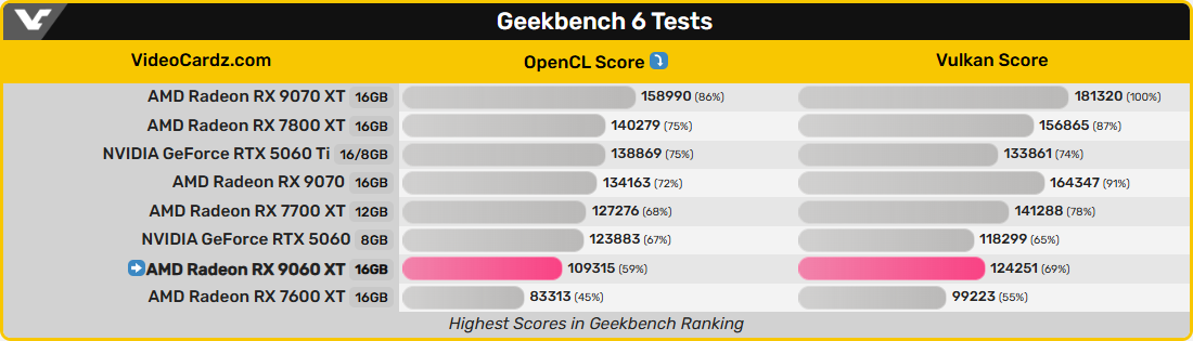 Про технічні характеристики відеокарти Radeon RX 9060 XT ми розповідали в матеріалі з нагоди анонсу. В OpenCL-тесті новий 3D-прискорювач набрав 109 315 балів, а в Vulkan-бенчмарку його результат склав 124 251 бал. Це відповідно на 31% та 25% більше показників Radeon RX 7600 XT — прямої попередниці нової відеокарти.