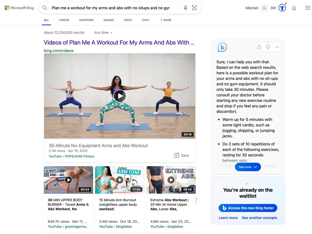 Тепер у Bing після запиту окрім стандартного списку сайтів у правій частині екрана виводитиметься вікно з відповідями від ШІ та буде можливість почати чат із помічником. Він уміє відповідати на складні запити чи виділяти основні моменти у великій статті. У новому Bing можна вводити запити довжиною до 1000 слів і отримувати розгорнуту відповідь від ШІ. Пріоритетний доступ до чату мають ті користувачі, хто встановив браузер Edge з Bing за замовчуванням основними на ПК. Іншим для початку повноцінного чату з ШІ потрібно почекати в черзі. Також нова функція недоступна без авторизації облікового запису Microsoft. У найближчих планах запуск мобільної версії пошукової системи з чат-ботом.
