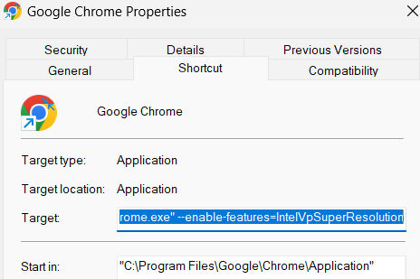 Технологія буде доступна не лише на дискретних відеокартах Intel Arc, а й на вбудованих рішеннях, починаючи з процесорів Core 10-го покоління. Ви можете спробувати активувати Intel Video Super Resolution на Chrome версії 109 і новіше. У браузері має бути увімкнене апаратне прискорення. Після цього у властивості ярлика потрібно додати спеціальний параметр запуску, який активує масштабування Intel.