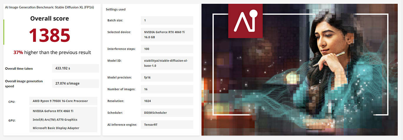 В основі Procyon AI Image Generation Benchmark лежить модель Stable Diffusion. У бенчмарку доступні два варіанти тесту: на базі Stable Diffusion XL для топових графічних процесорів, а у разі решти GPU пропонується використовувати Stable Diffusion 1.5. Різниця між ними полягає в роздільній здатності створюваного зображення (1024x1024 або 512x512 пікселів). Заявлено підтримку бібліотек Intel OpenVINO, Nvidia TensorRT й ONNX Runtime з DirectML, тобто можна протестувати GPU Intel, Nvidia та AMD.