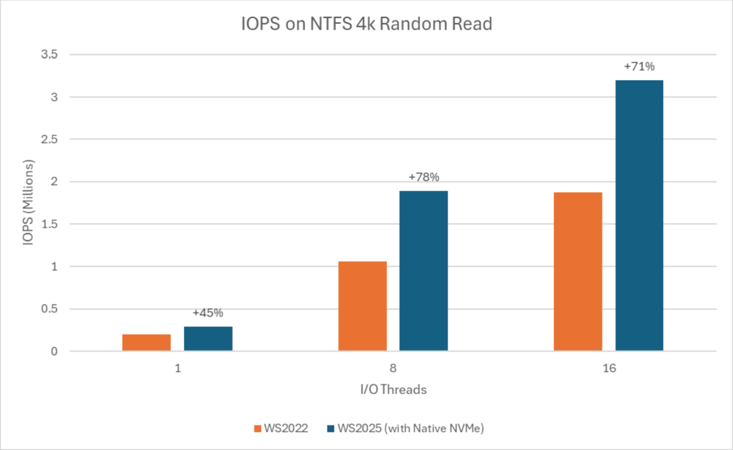 Базові тести продуктивності за допомогою DiskSpd.exe показують зростання продуктивності в нативному NVMe до 80% за кількістю операцій IOPS при зниженні циклів обробки I/O на CPU до 47%. Це безпосередньо вплине на швидкість транзакцій у базах даних, у віртуалізації, у файлових серверах, у машинному навчанні та інших сферах.