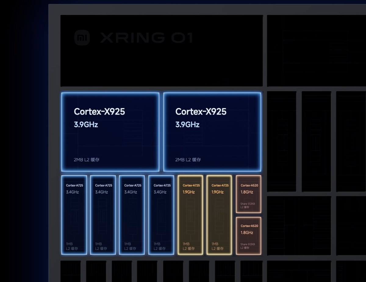 Чип Xring O1 оснащений 10 ядрами, які об’єднані в чотири кластери. Це два ядра Cortex-X925 з тактовою частотою 3,9 ГГц, чотири ядра Cortex A725 з частотою 3,4 ГГц, два Cortex A725 1,9 ГГц і два Cortex A520 1,8 ГГц. Також SoC отримав графіку Immortalis-G925 з 16 обчислювальними ядрами. Присутній вбудований блок NPU 44 на TOPS.