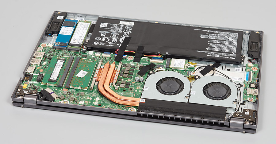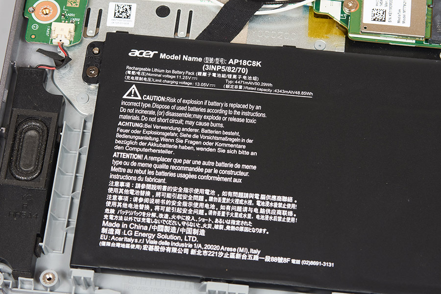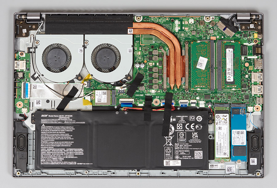 Acer Aspire 5 A515-57 зроблений за класичною схемою, де під місцем для долонь розташована акумуляторна батарея, а всю іншу площу займає материнська плата та її елементи.