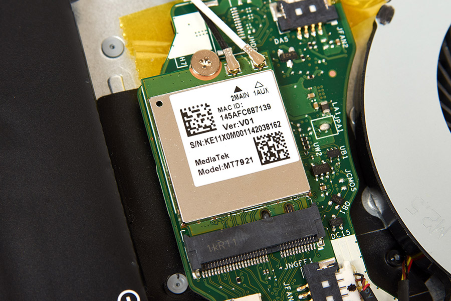 Мережевий модуль представлений MediaTek MT7921, який не часто зустрічається та підтримує Wi-Fi 6 (IEEE 802.11ax) з Bluetooth 5.2. Враховуючи що наш ноутбук є семплом, то швидше за все, в масові пристрої вже будуть встановлювати Intel AX201.