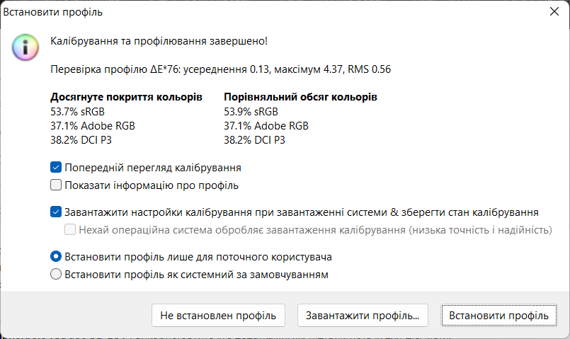 Як бачимо, якість матриці не на висоті, всього 53,7% sRGB, чого недостатньо для роботи з графічними застосунками. Також нестачу кольорів буде помітно в web-браузері, але для невибагливого користувача її більш ніж достатньо.