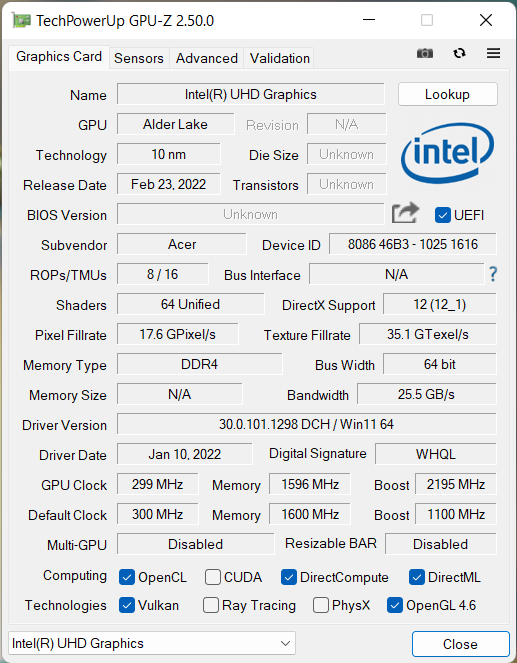 Вбудоване графічне ядро Intel UHD Graphics має 64 блоки та працює на максимальній частоті 1100 МГц.