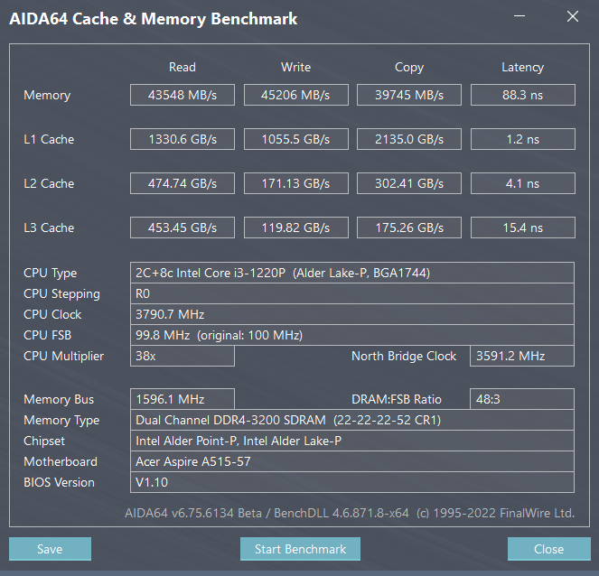 Основою нашої моделі є процесор Intel Core i3-1220P сімейства Alder Like. Він виконаний з двома продуктивними ядрами з підтримкою Hyper-Threading та вісьма енергоефективними ядрами, що в сумі дають спроможність обчислювати 12 потоків. До недавнього часу про таку кількість в серії Core i3 можна було тільки мріяти. Також він оперує кеш-пам’яттю третього рівня обсягом 12 МБ — ще одне досягнення для цієї серії. Працює він на базовій частоті 2000 МГц, але може автоматично розганяти P-ядра до 4400 МГц, тоді як E-ядра — лише до 3300 МГц. Його рівень TDP складає 28 Вт, який може підвищуватися при Turbo Boost до 64 Вт.