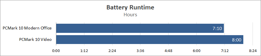 Щоб перевірити час роботи від акумулятора, було проведено кілька тестів за допомогою PCMark. Тест Modern Office симулює комбіноване офісне навантаження, другий тест вимірює час роботи при відтворенні відео формату Full HD. Яскравість екрана була зафіксована на 120 кд/м², гучність — 50%, щоб можна було порівняти результати з іншими ноутбуками.