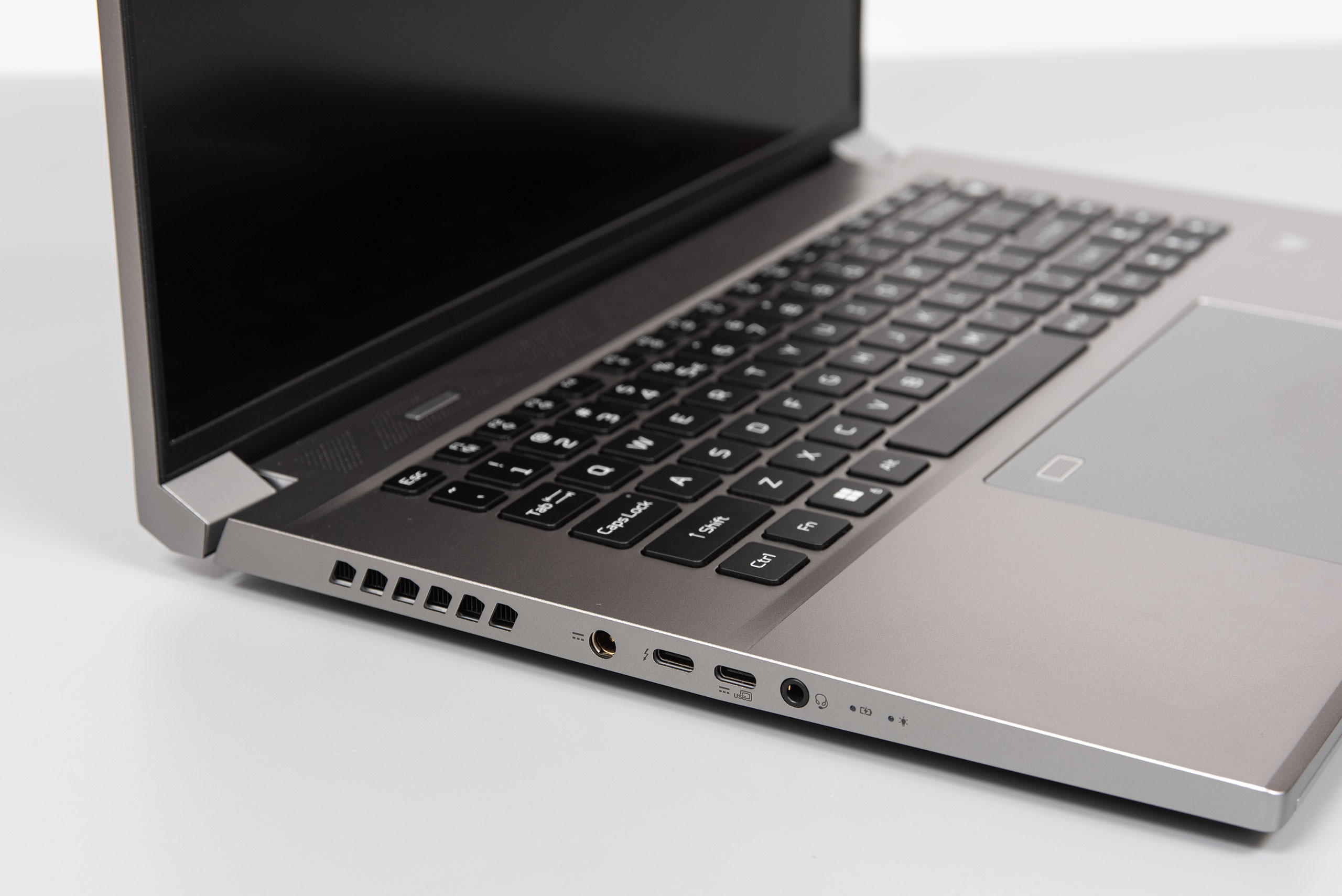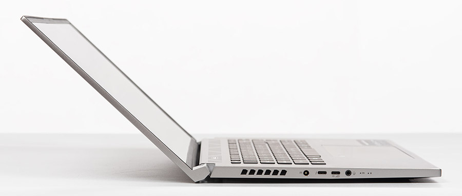 Через невелику товщину пристрою та конструктивні особливості кришки всі порти та роз’єми знаходяться по боках лептопа. Зліва є індикатори активності ноутбука та накопичувача, 3,5-мм комбінований роз’єм для гарнітури, два порти USB-C та роз’єм для під’єднання блока живлення. Поруч присутні отвори для виходу повітря.