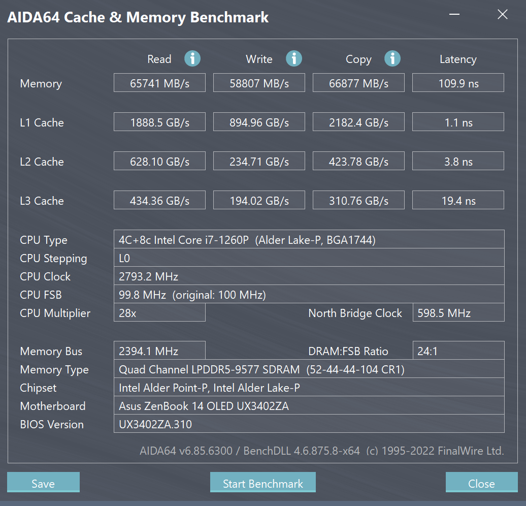 Вбудована пам'ять на 16 ГБ працює в «чотириканальному» режимі на частоті 4800 МГц із затримками 52-44-44-104-1Т. OEM виробника та точне маркування чипів встановити не вдалося.