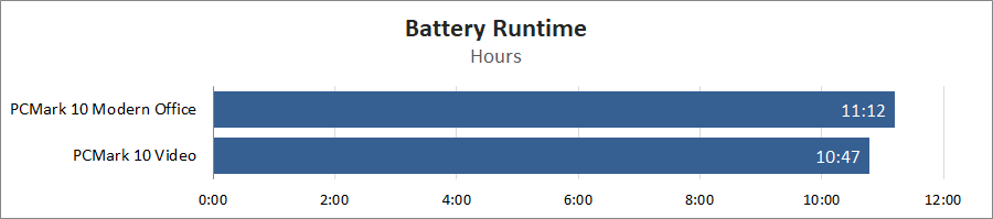 Щоб перевірити час роботи від акумулятора, було проведено декілька випробувань за допомогою спеціалізованих тестів PCMark. Тест Modern Office симулює комбіноване офісне навантаження. Тест Video вимірює час роботи при відтворенні відео формату Full HD. Яскравість екрану була виставлена на 50% від максимальної. Підсвічування клавіатури увімкнене на повну. Виставлений середній, збалансований режим використання батареї.