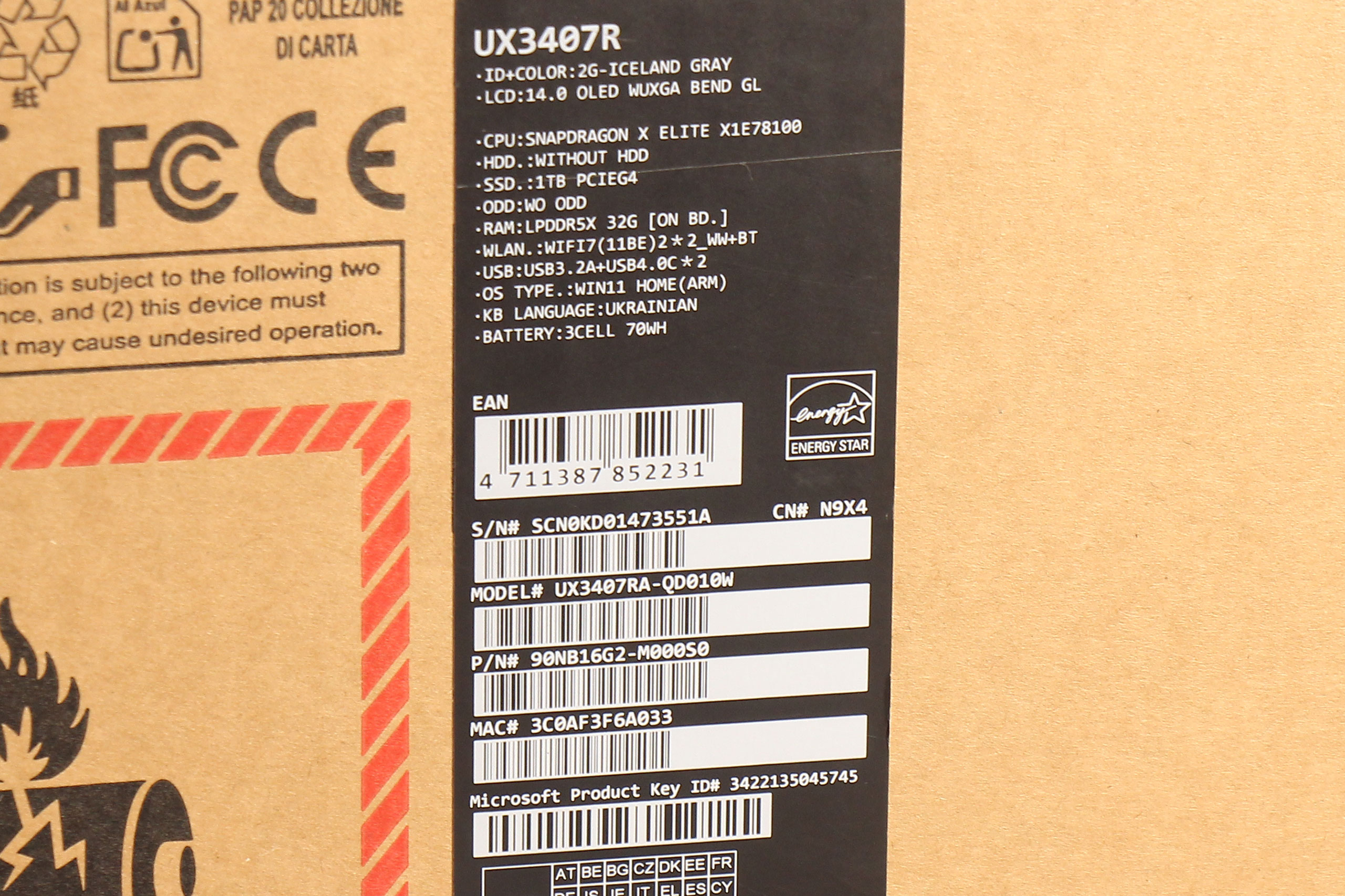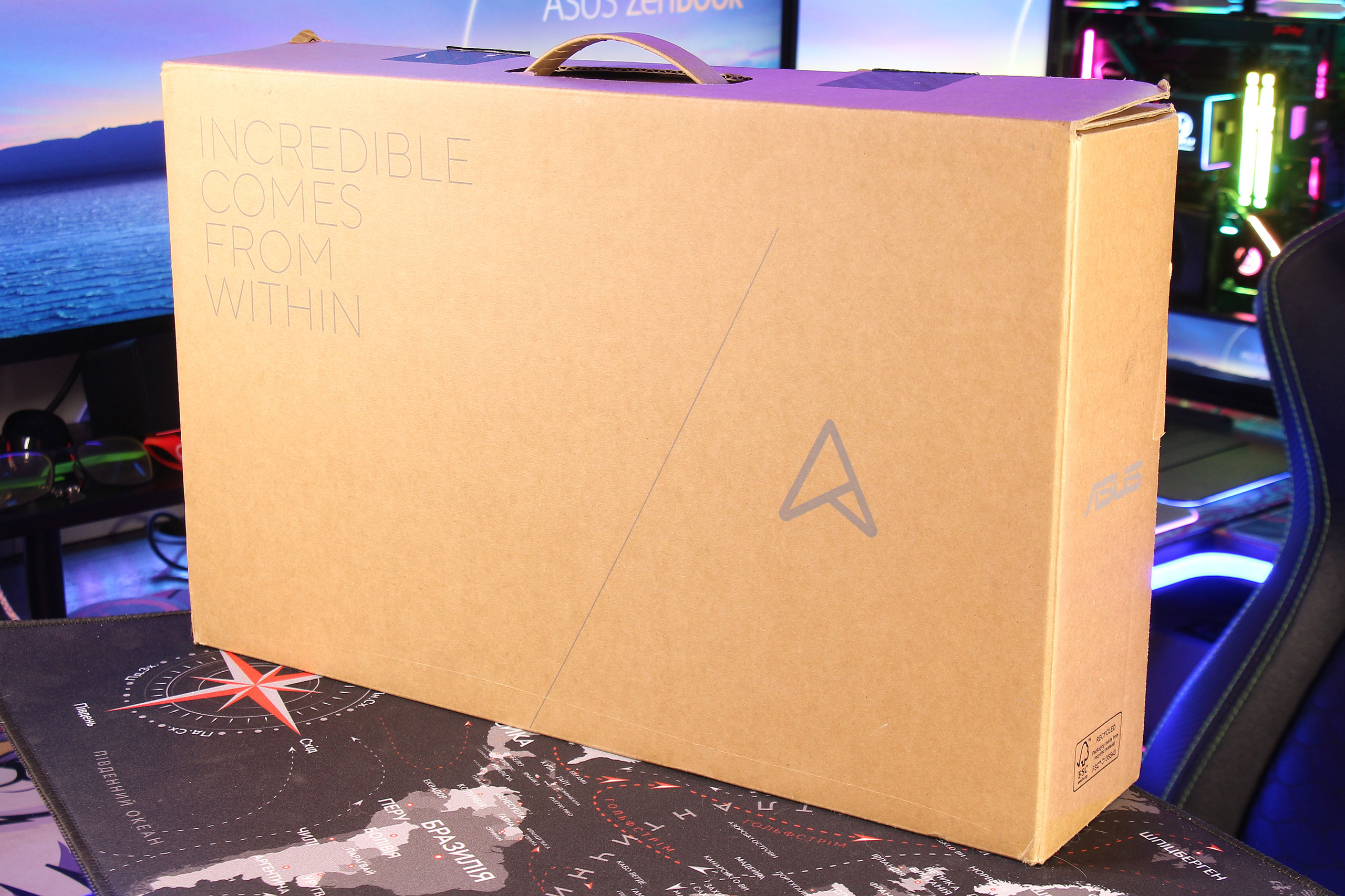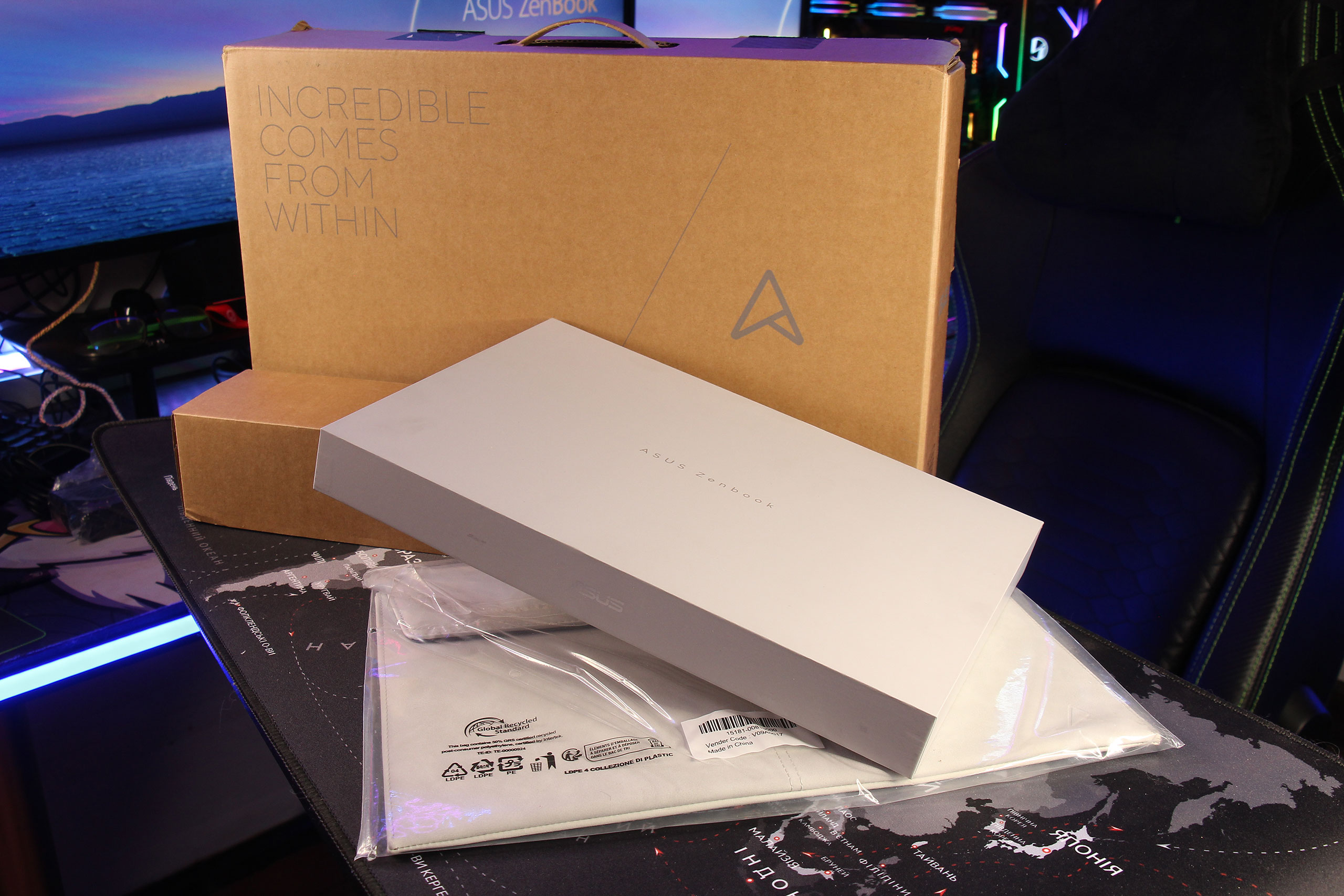Ноутбук постачається у стандартній картонній коробці ASUS ззовні, але всередині за традицією Zenbook знаходиться більш гламурна коробка з самим пристроєм.