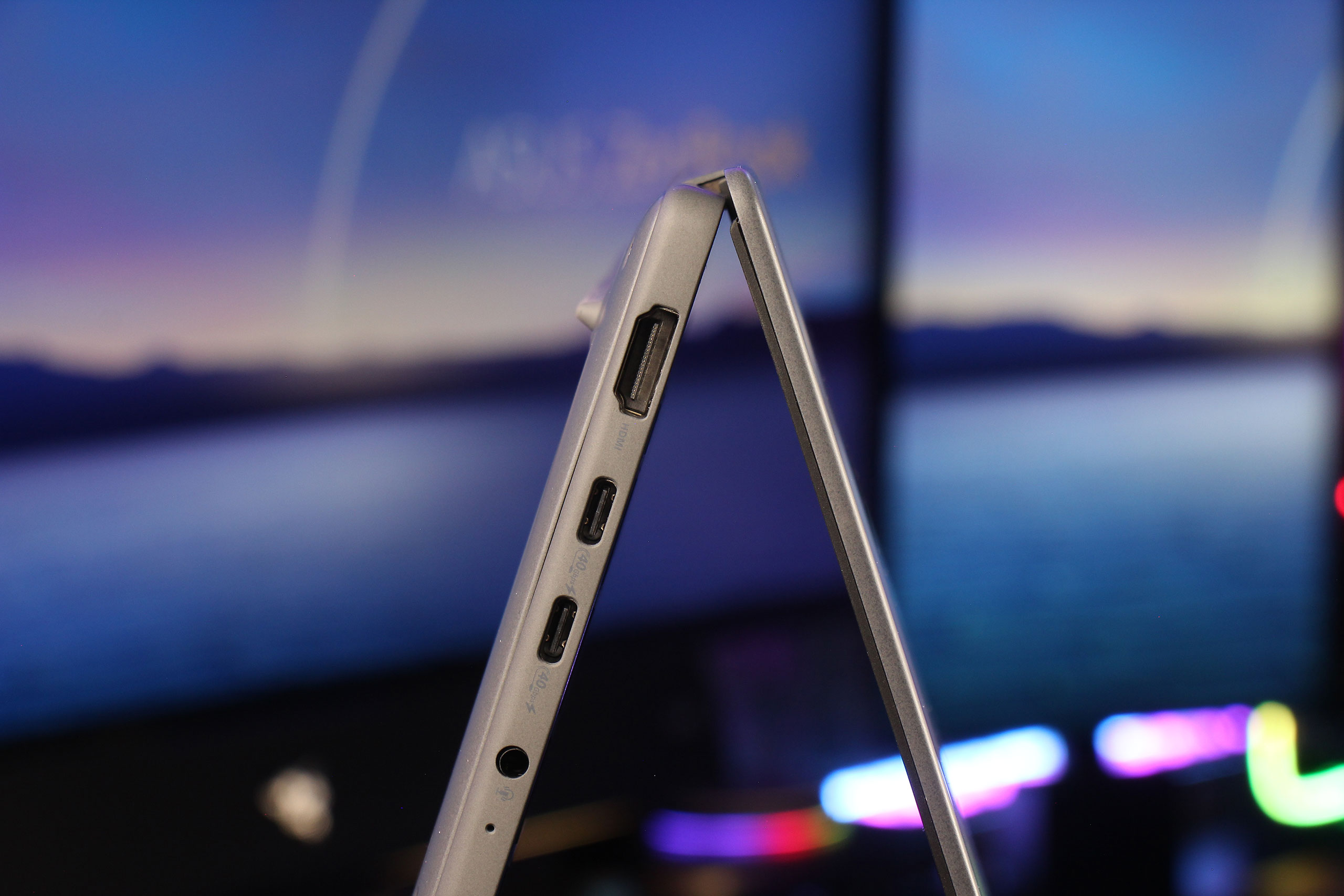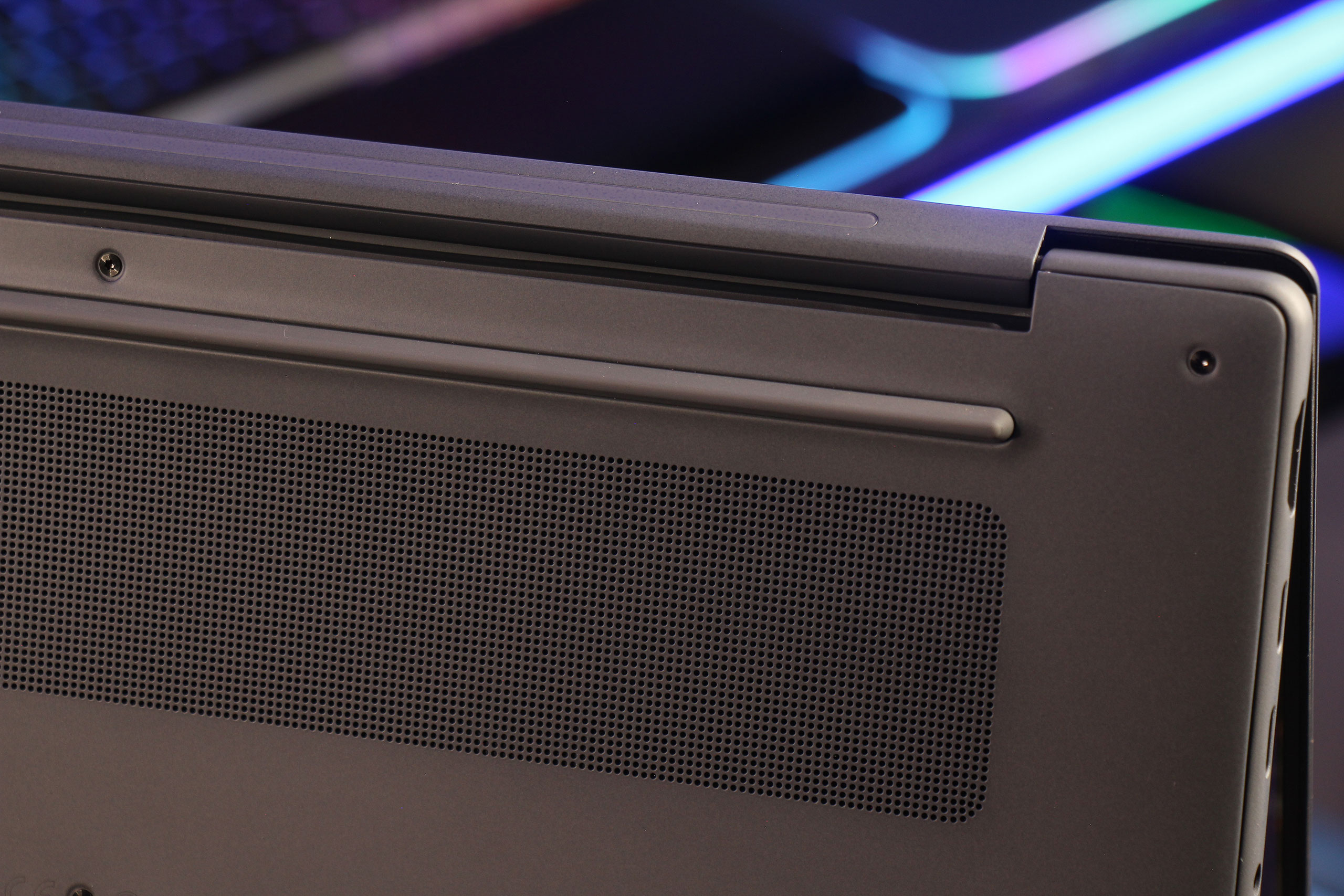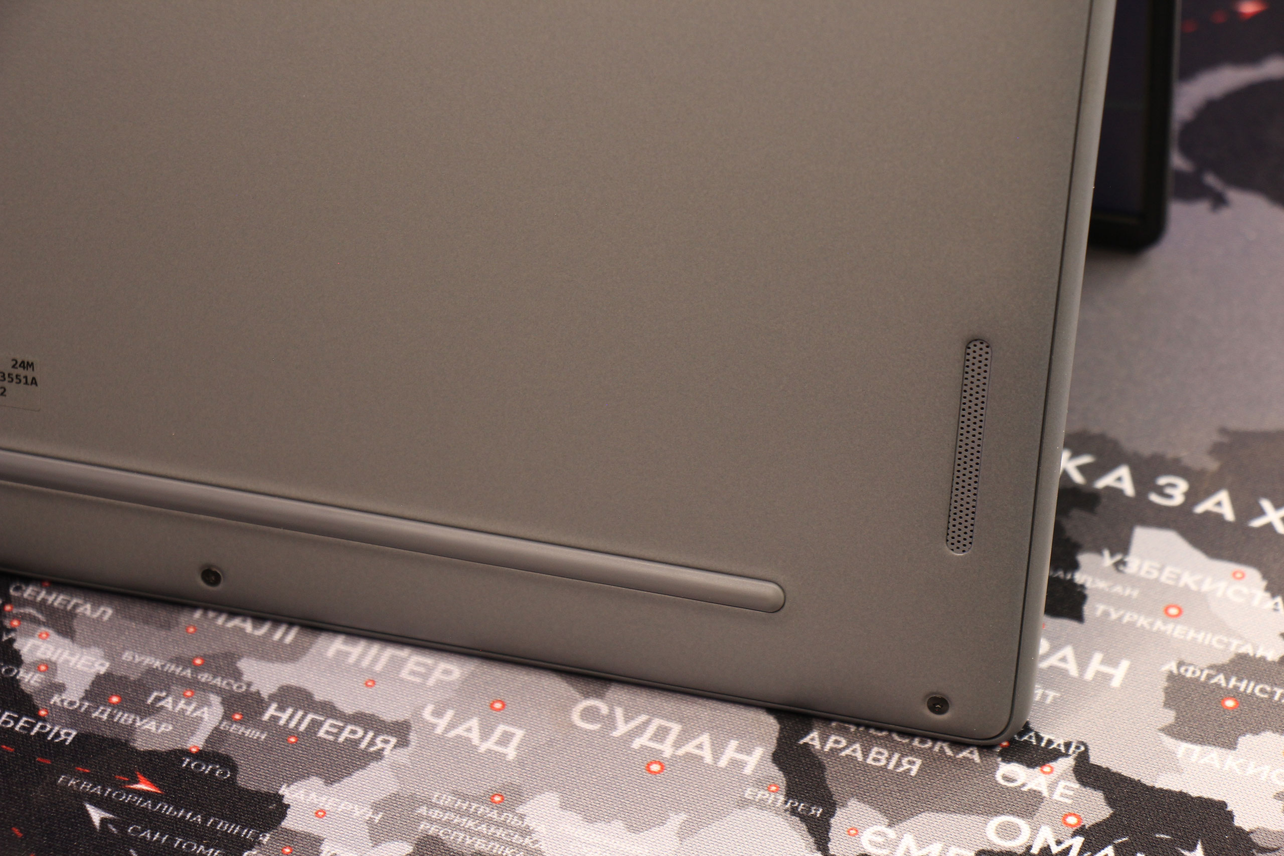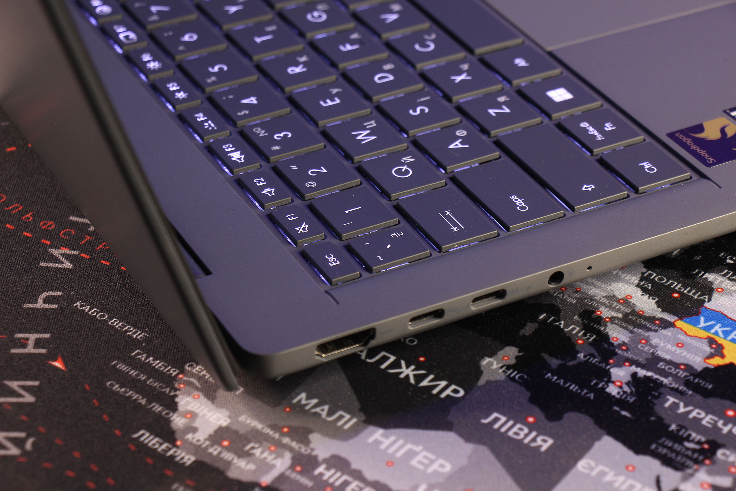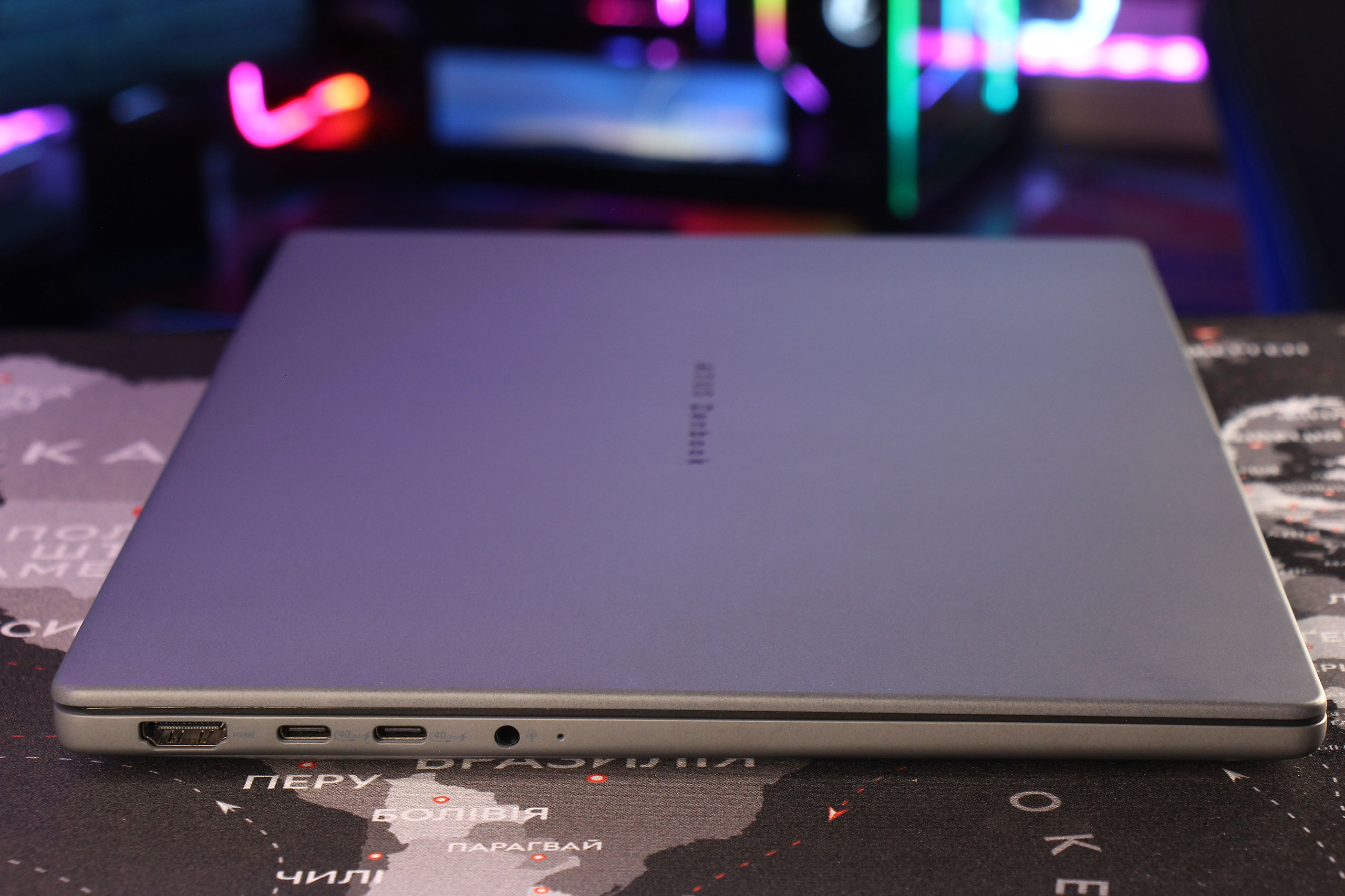 Розміщення портів практично-мінімалістичне: ліворуч — два USB 4.0 Type‑C з підтримкою 40 Гбіт/с, Power Delivery та DisplayPort, HDMI 2.1, комбінований аудіороз’єм 3,5 мм та світлодіодний індикатор. Справа — тільки один USB 3.2 Gen2 Type‑A. Таке розташування зручне для правшів, залишаючи простір для роботи з мишею.