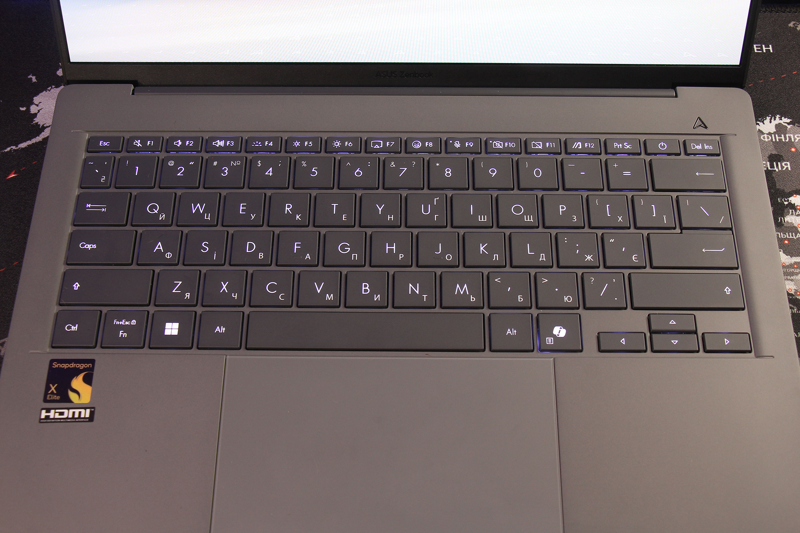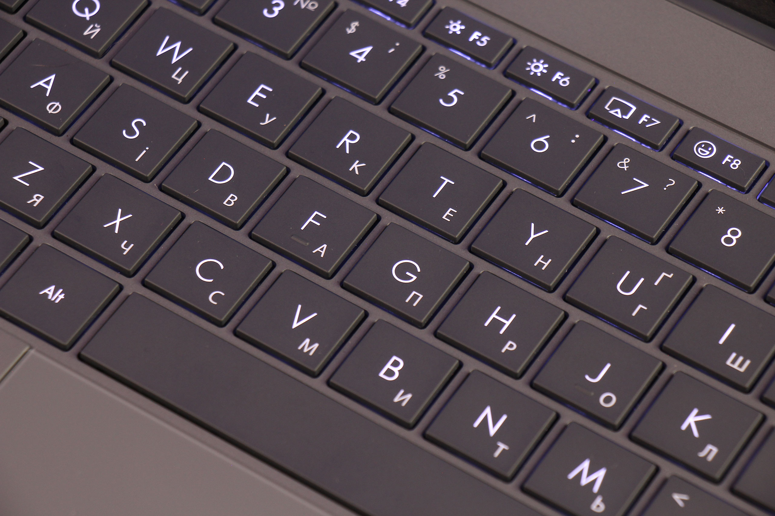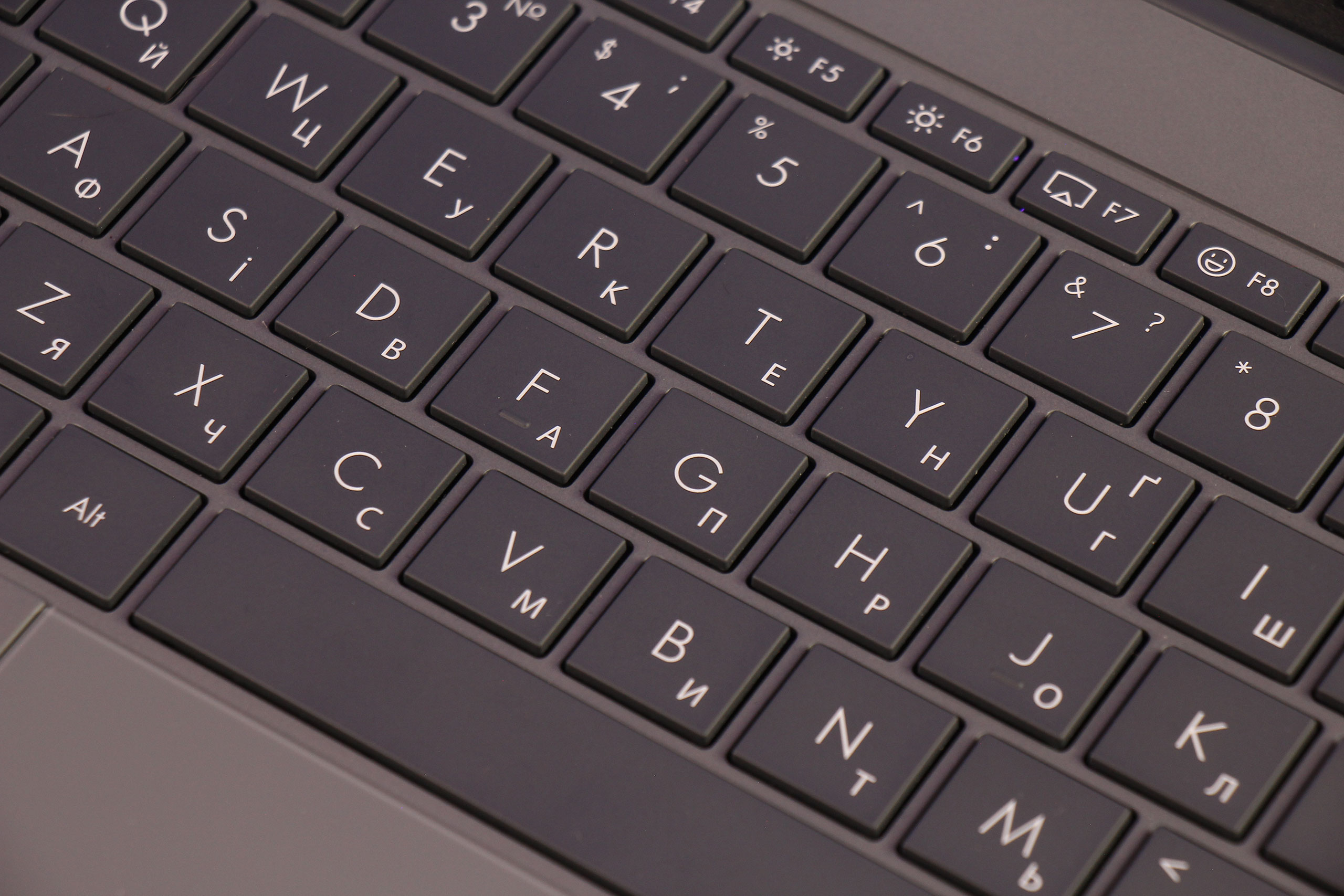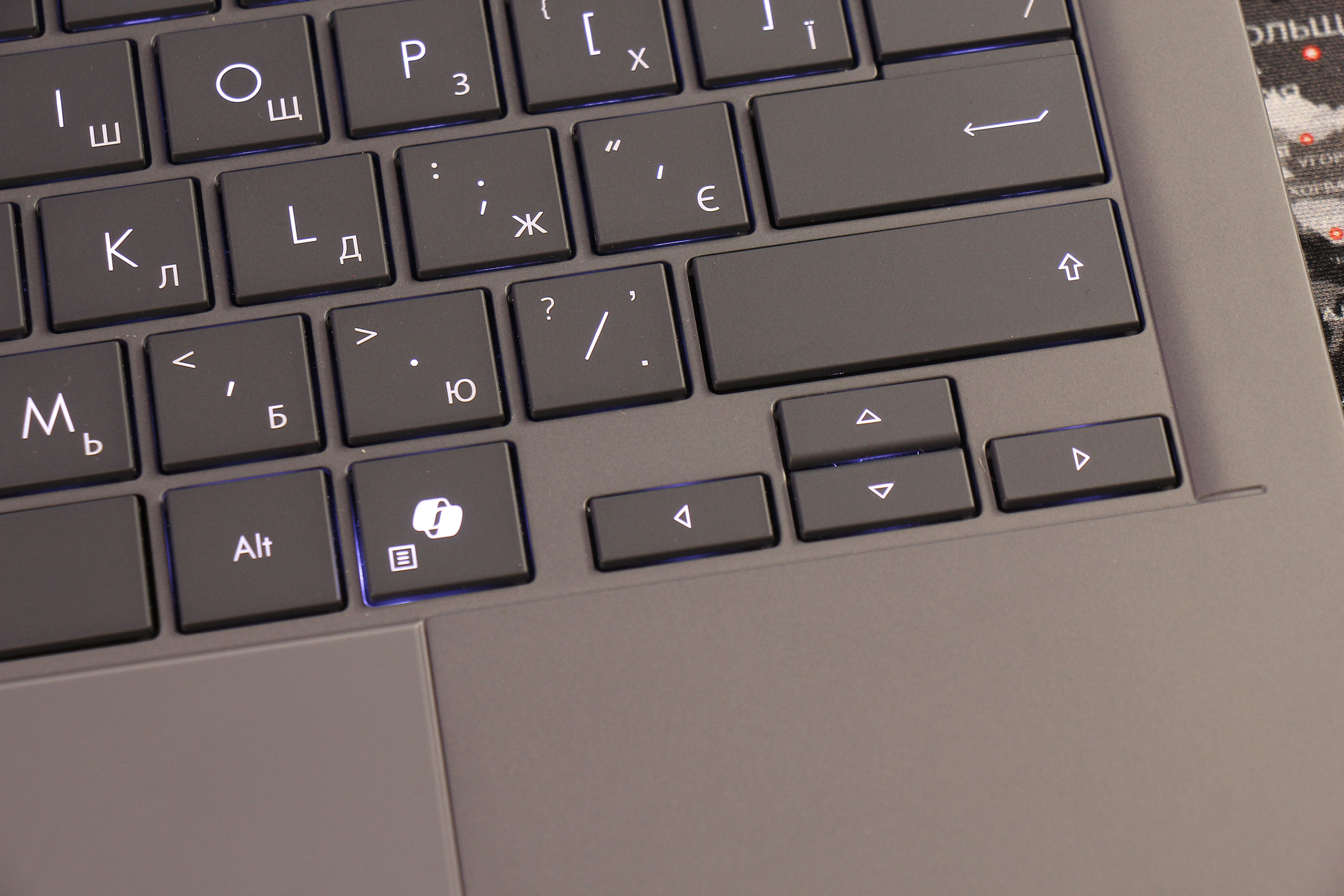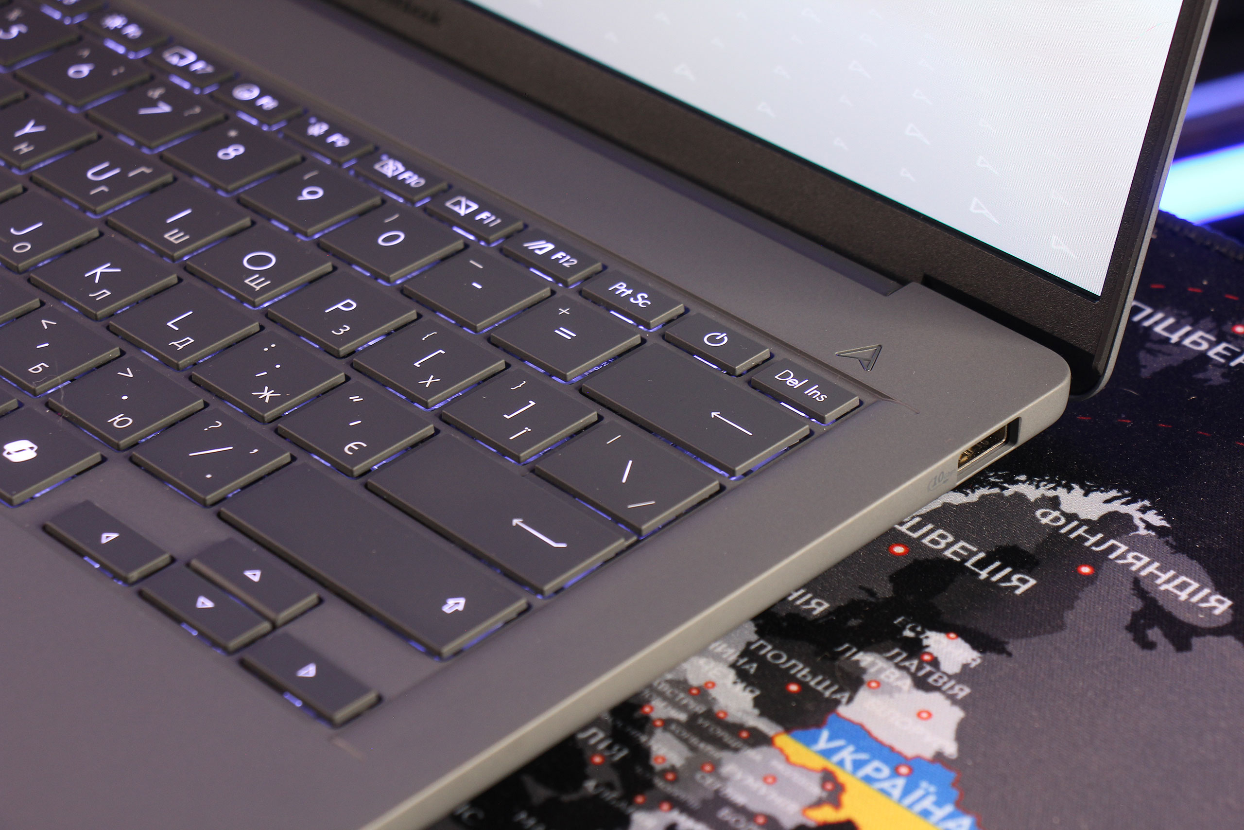 Острівна клавіатура стандартна для ультратонких ноутбуків. Відгук м’який, але чіткий, звук тихий. Розкладка стандартна з повнорозмірними основними клавішами та зменшеними додатковими.