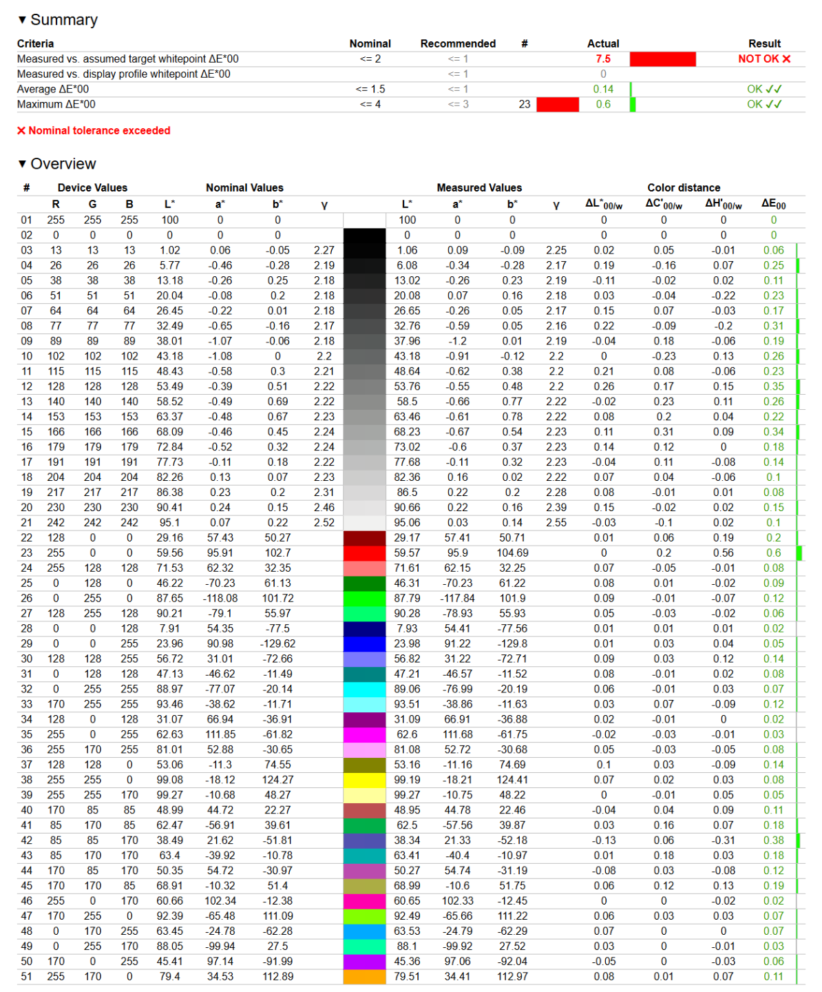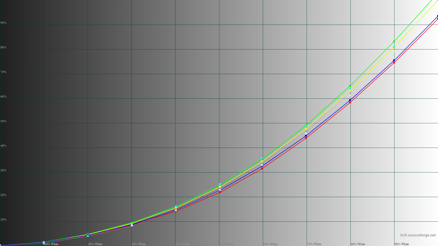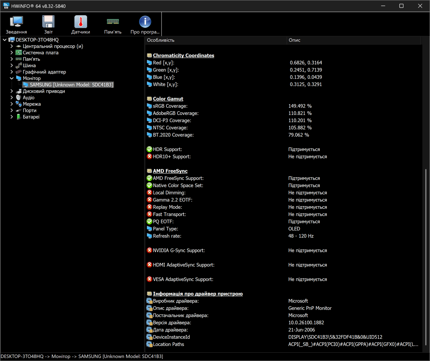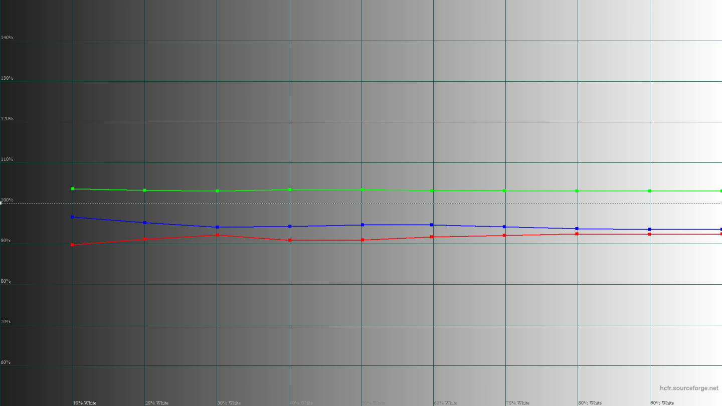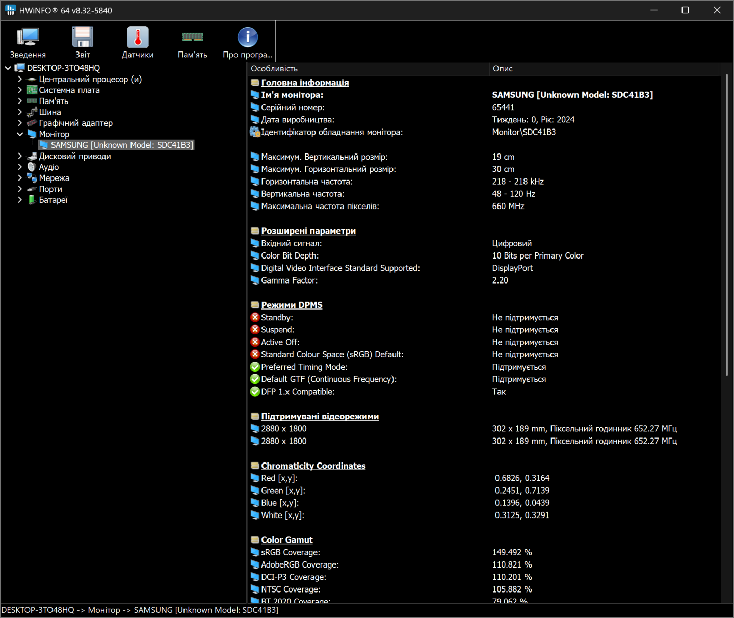 Заявлене та фактичне колірне охоплення становить 100% простору DCI-P3, що є стандартом для роботи з кольором у відеомонтажі, колірній корекції та графічному дизайні. Точність відтворення кольорів відповідає професійним вимогам, роблячи екран придатним для серйозної креативної роботи.