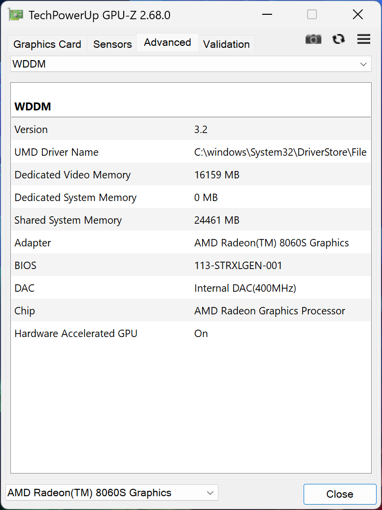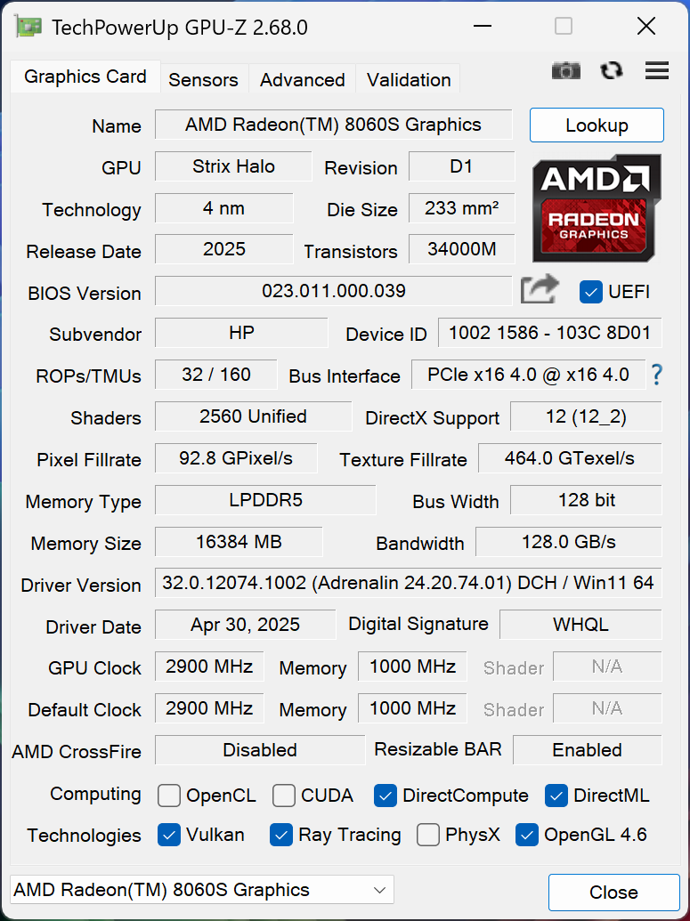 Графічна підсистема представлена інтегрованим AMD Radeon 8060S — саме це є справжнім проривом для вбудованої графіки. Результати вражають: продуктивність GPU може бути порівняна з мобільними версіями NVIDIA GeForce RTX 4060, а в деяких сценаріях наближається до RTX 4070.
