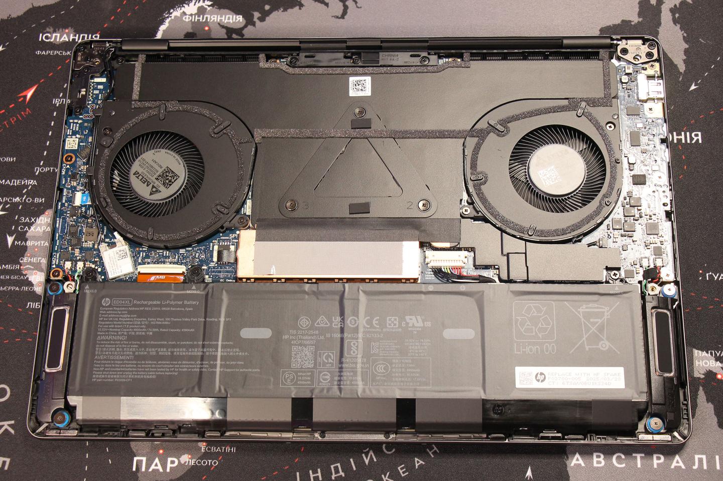 Система охолодження використовує технологію HP Vaporforce з паровою камерою та двома вентиляторами. Повітря забирається через отвори на нижній панелі та виводиться через решітки біля шарніра. Така конструкція ефективно відводить тепло від потужного AMD SoC, хоча при інтенсивних навантаженнях вентилятори стають чутними.